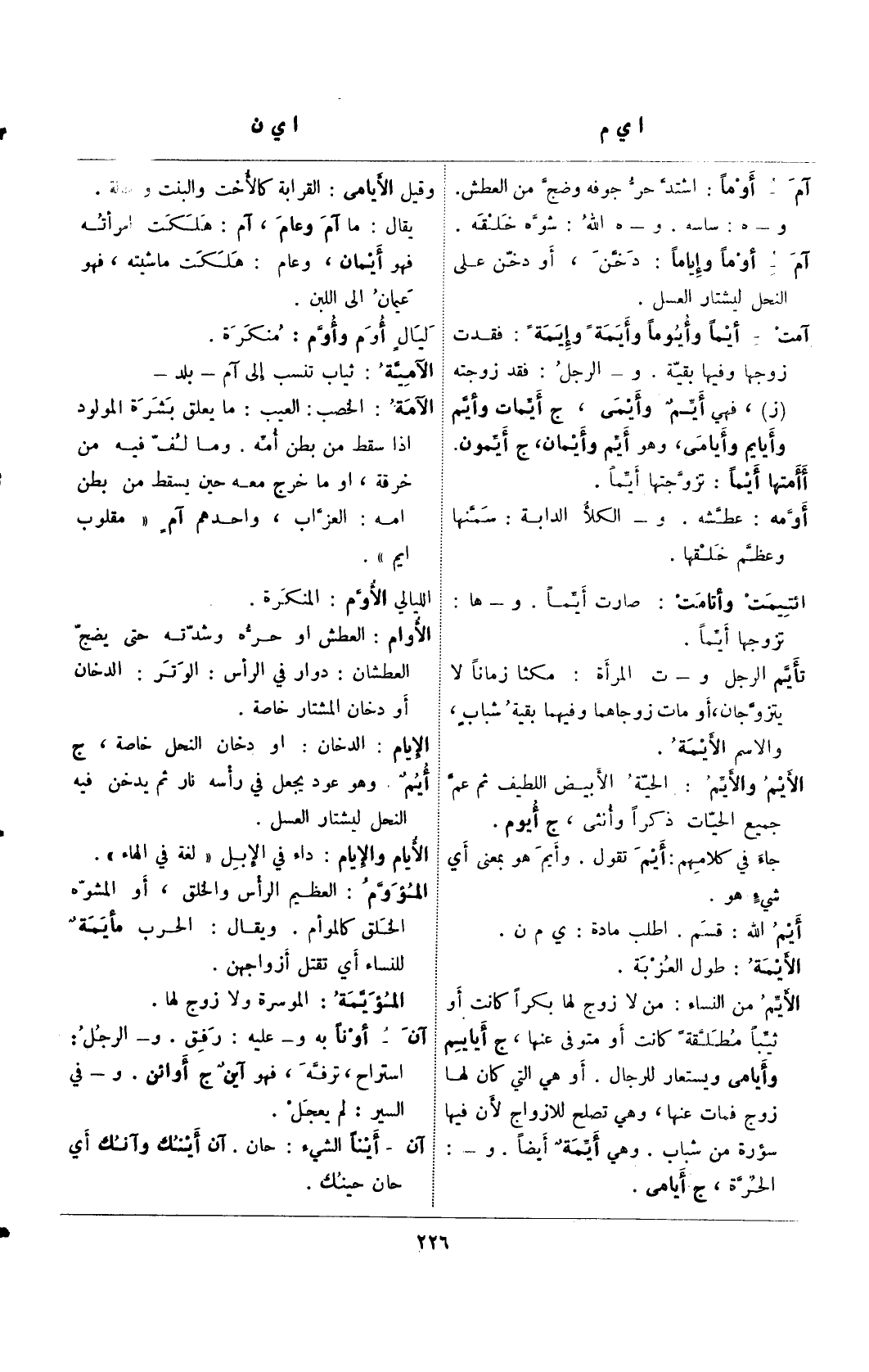 الأيَّم من النساء: من لا زوج لها بكرًا كانت أو ثيبًا مطلقة كانت أو متوفى عنها، ج أيايم وأيامى ويستعار للرجال. أو هي التي كان لها زوج فمات عنها، وهي تصلح للأزواج لأن فيها سؤرة من شباب. وهي أيمة أيضًا. و-: الحرة، ج أيامى.
