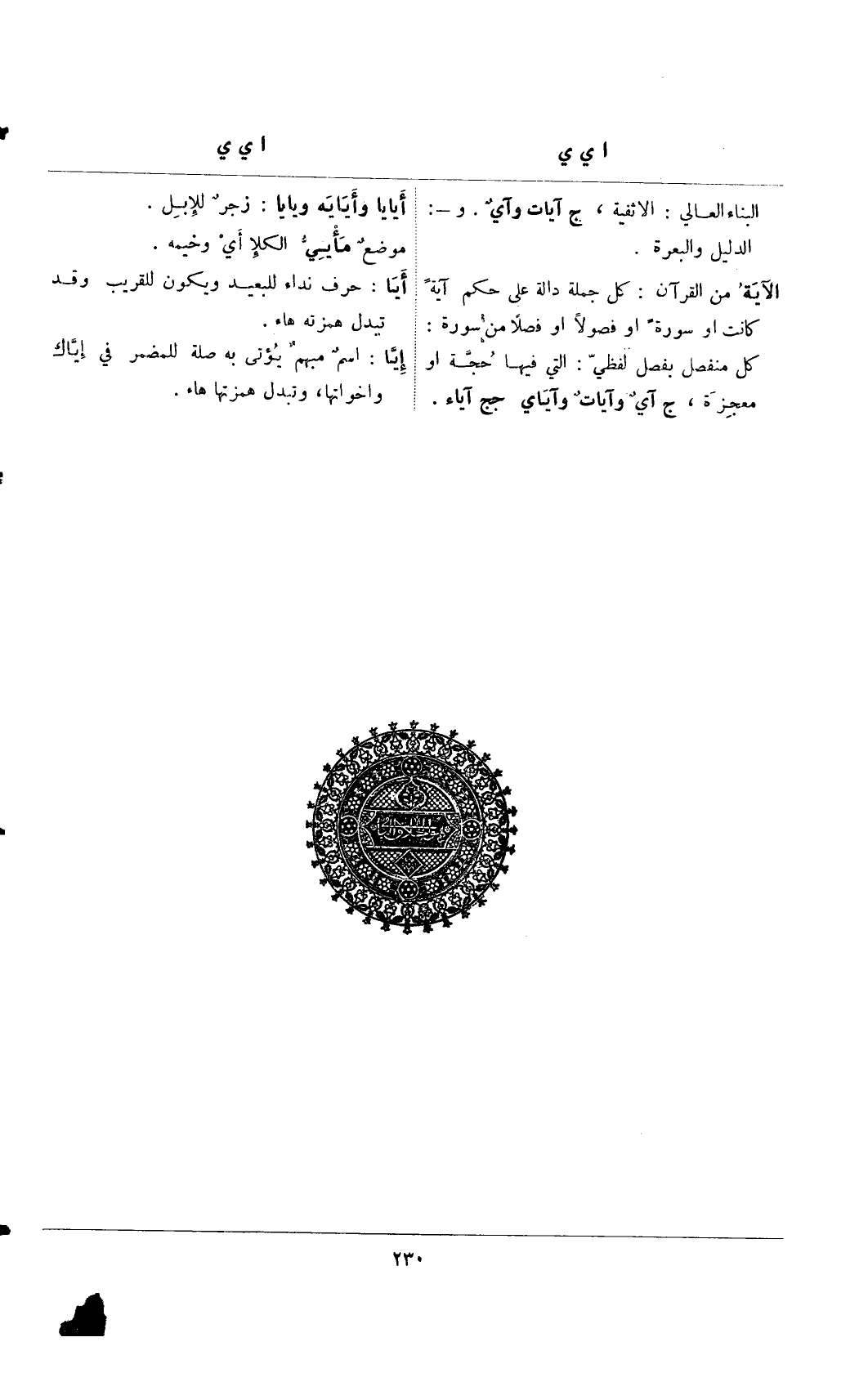 الآية من القرآن: كل جملة دالة على حكم آيةً كانت أو سورة أو فصولًا أو فصلًا من سورة: كل منفصل بفصل لفظي: التي فيها حُجة أو معجزة، ج آي وآيات وآياي جج آياء.