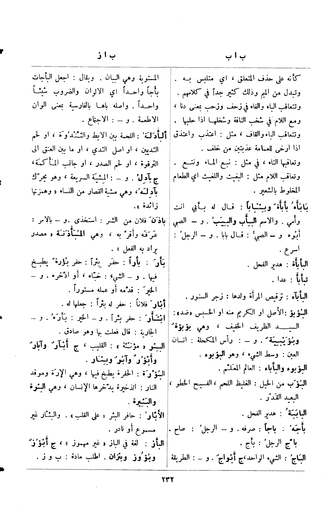 بابأة بأبأة وبئبابًا: قال له بأبي أنت وأمي. والاسم البأب والبيب. و-الصبي أبوه و-الصبي: قال بابا. و-الرجل: أسرع.