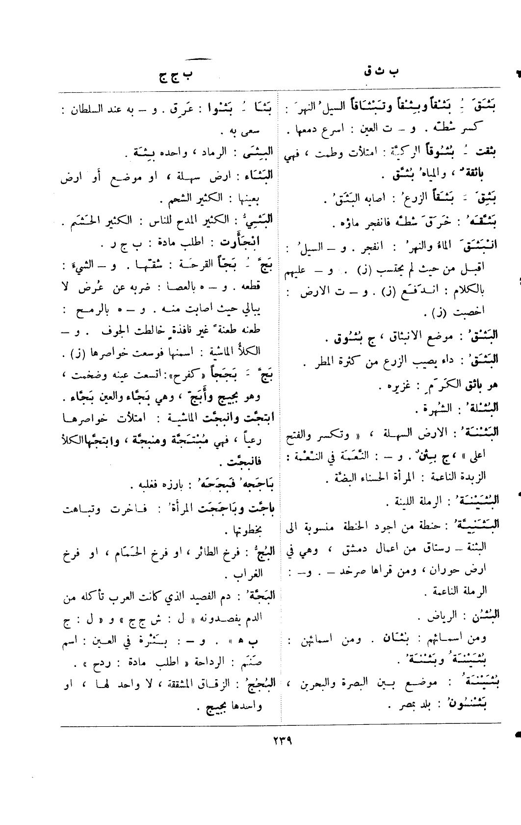 بج- بجًا القرحة: شقها. و- الشيء: قطعه. و- هـ بالعصا: ضربه عن عرض لا يبالي حيث أصابت منه. و-هـ بالرمح: طعنه طعنةً غير نافذةٍ خالطت الجوف. و-الكلأ الماشية: أسمنها فوسعت خواصرها (ز).