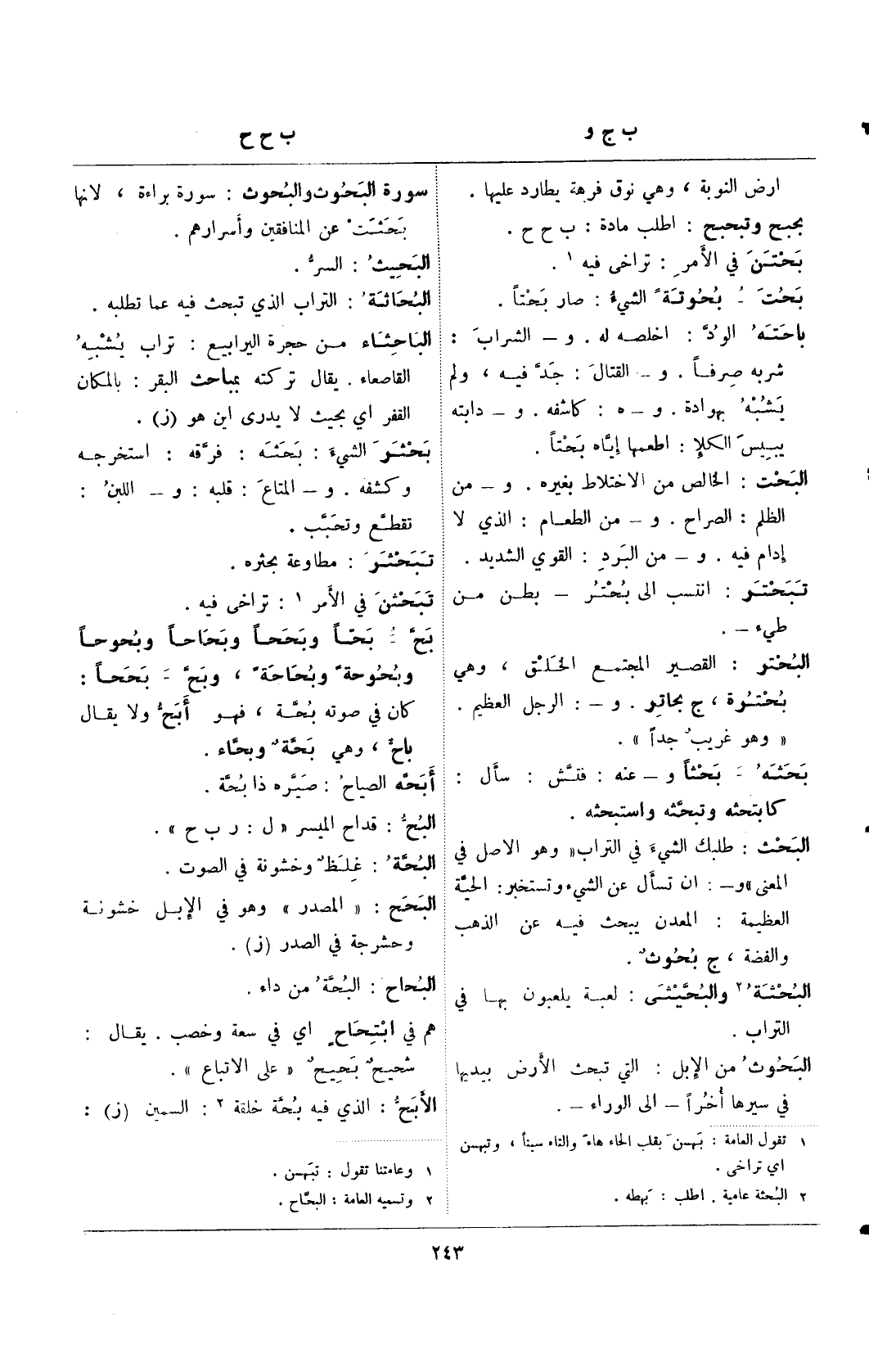 بح- بحًا وبجحًا وبحاحًا وبحوحً وبحوحة وبحاحة، وبح- بححًا: كان في صوته بحة، فهو أبح ولا يقال باح، وهي بحة وبحاء.