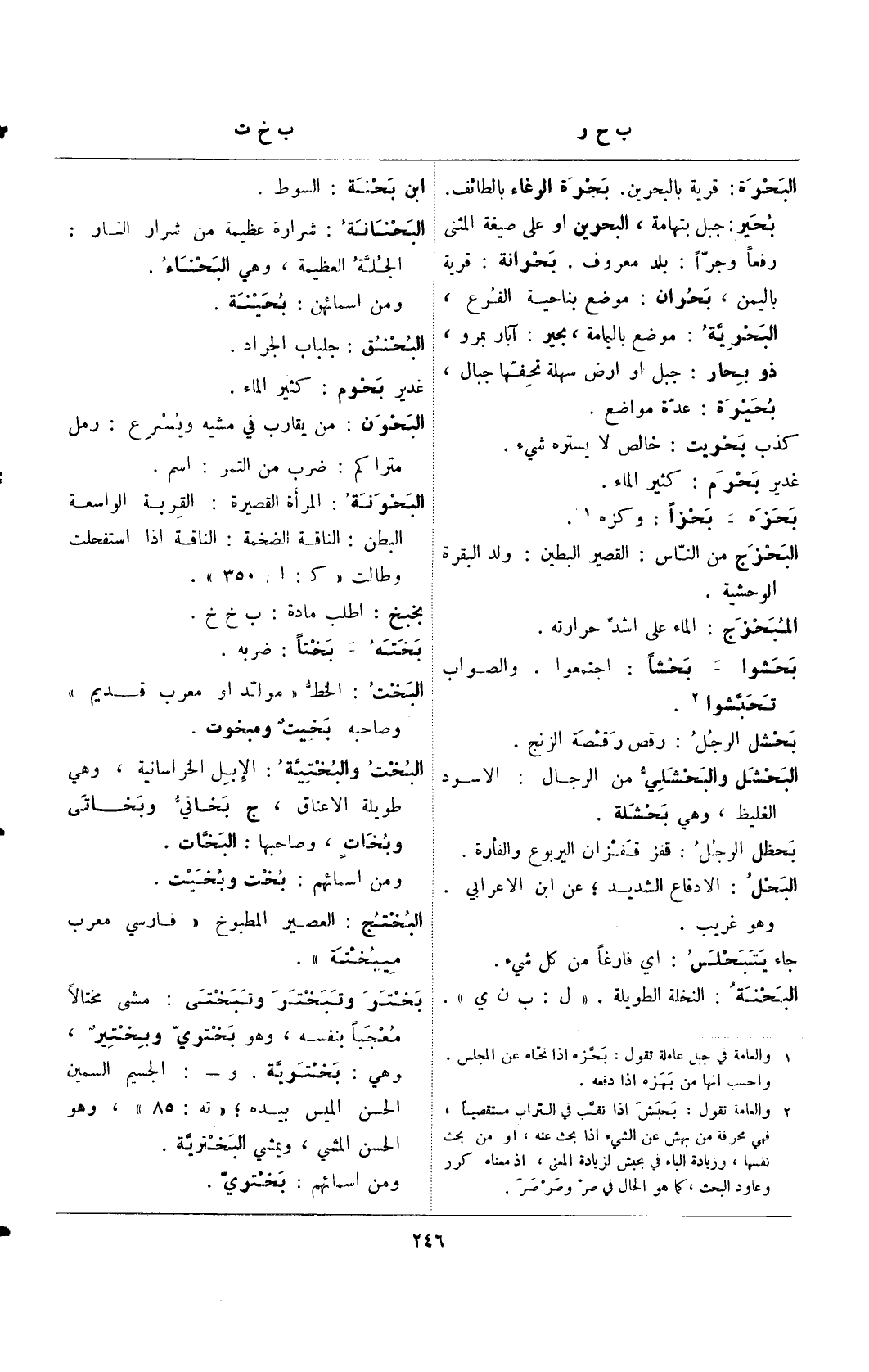 بحير: جبل بتهامة، البحرين أو على صيغة المثنى رفعًا وجرًا: بلد معروف. بحرانة: قرية باليمن، بحران: موضع بناحية الفرع، البحرية: موضع باليمامة، بحير: آبار بمرو، ذو بحار: جبل أو أرض سهلة تحفها جبال، بحيرة: عدة مواضع.