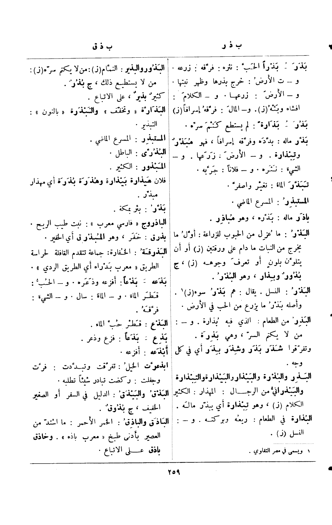 البذر والبذرة والبيذار والبيذارة والتبذارة والبيذراني من الرجال: المهذار: الكثير الكلام (ز)، وهو تبذارة أي يبذر ماله. البذارة في الطعام: ريعه وبركته. و-: النسل (ز).