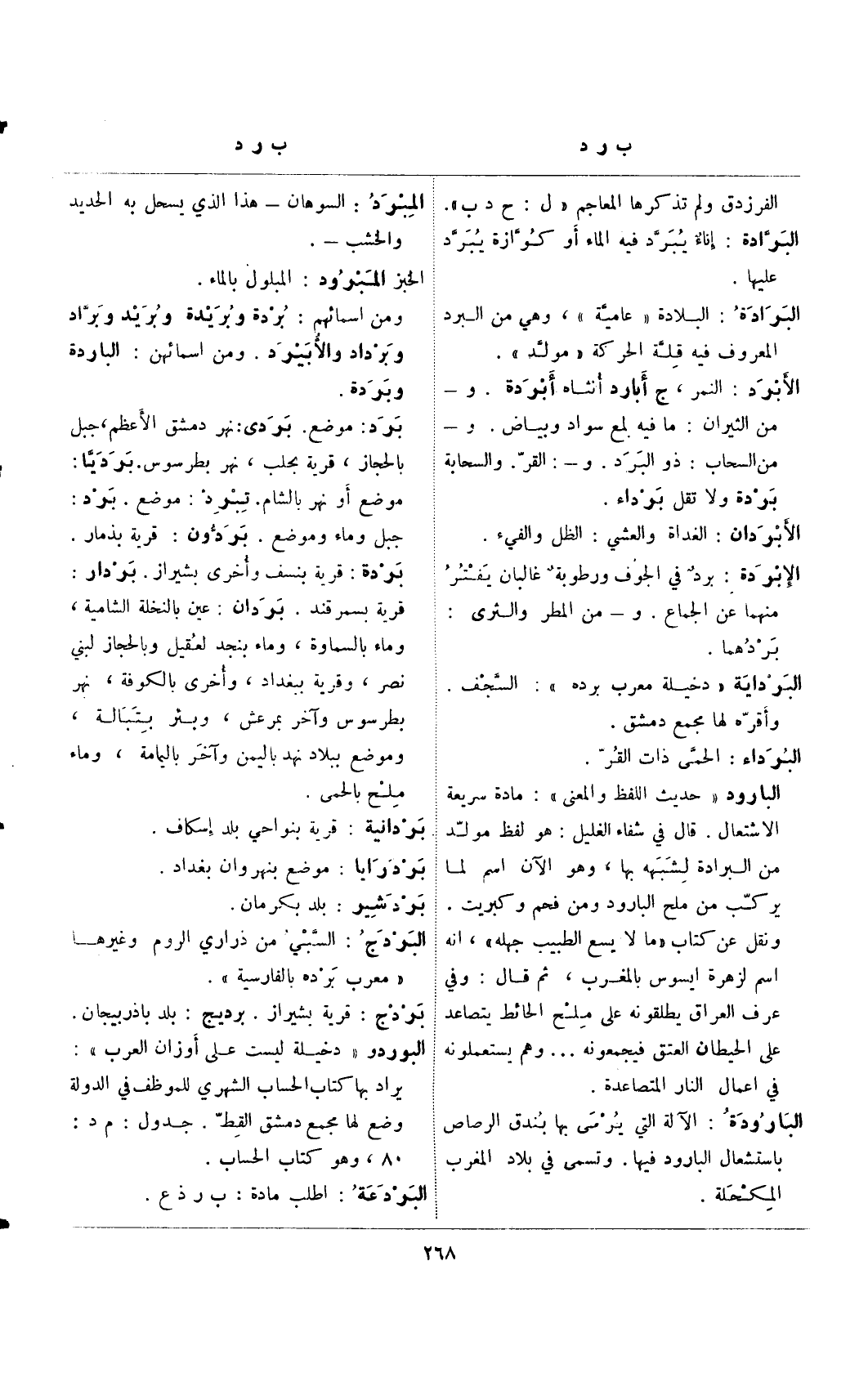 برد: موضع. بردى: نهر دمشق الأعظم، جبل بالحجاز، قرية بحلب، نهر بطوسوس. برديا: موضع أو نهر بالشام. تبرد: موضع. برد: جبل وماء وموضع. بردون: قرية بذمار.