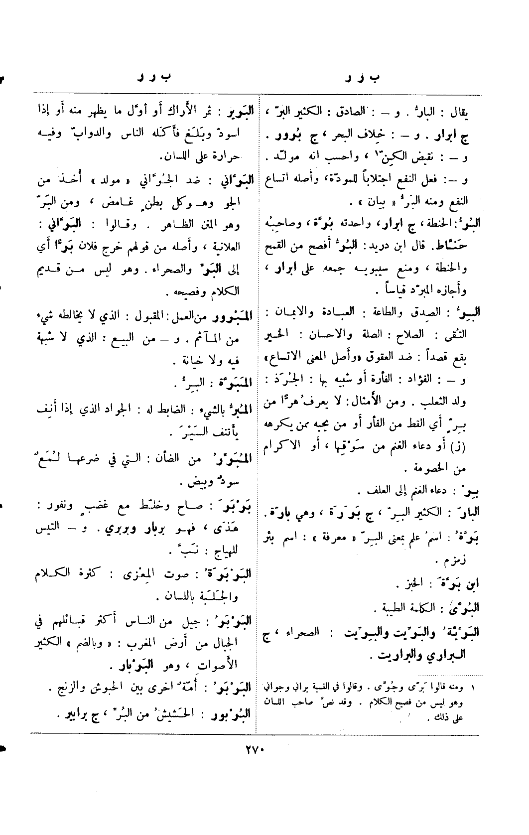 البر: الصدق والطاعة: العبادة والايمان: التقى: الصلاح: الصلة والإحسان: الخير يقع قصدا: ضد العقوق " وأصل المعنى الاتساع" و- الفؤاد: الفأرة أو شبيه بها: الجرذ: ولد الثعلب. ومن الأمثال: لا يعرف هرا من بر أي القط من الفأر أو من يحبه ممن يكرهه (ز) أو دعاء الغنم من سوقها، أو الاكرام من الخصومة.