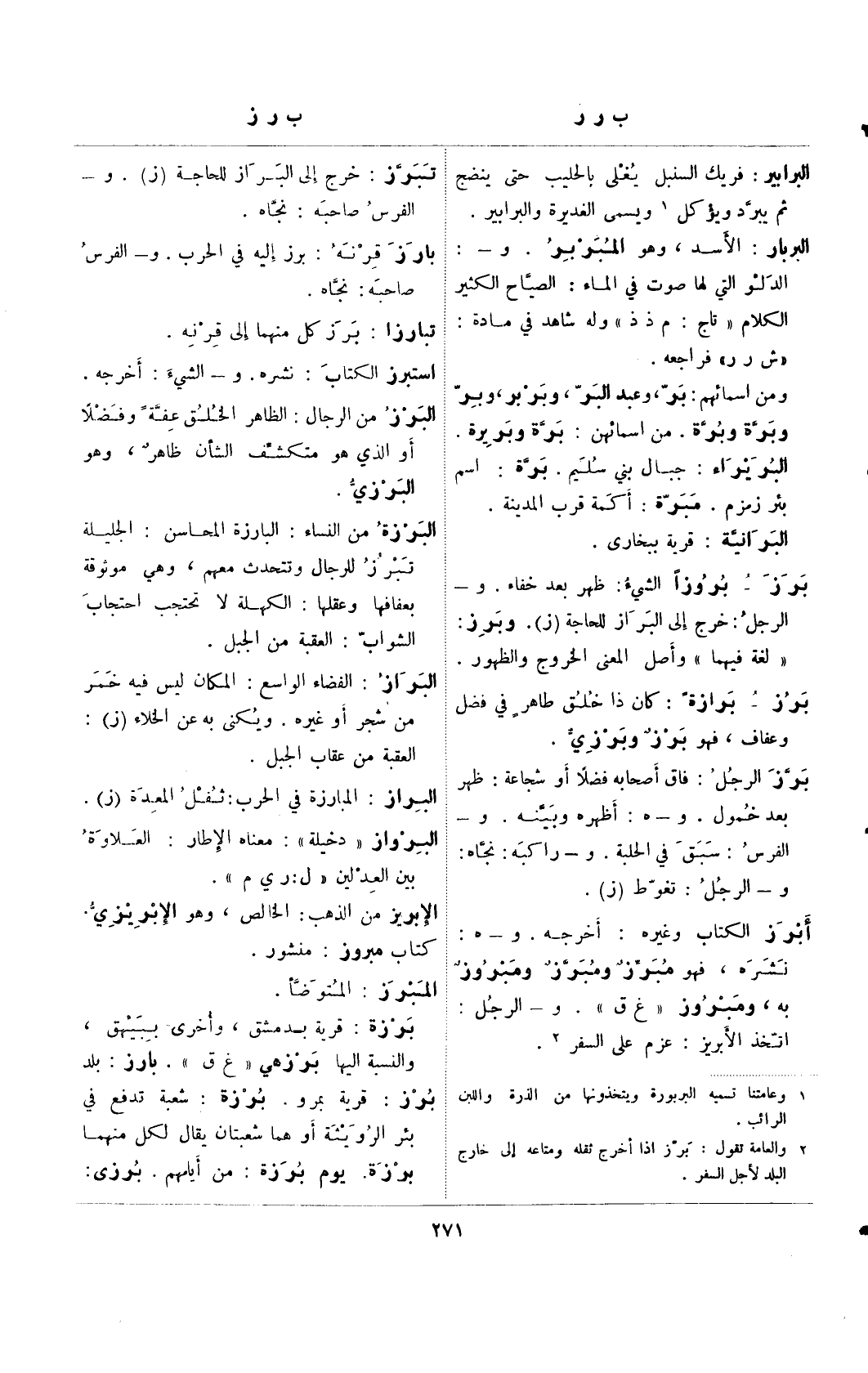 برزة: قرية بدمشق، وأخرى ببيهق، والنسبة إليها برزهي "غ ق". بارز: بلد