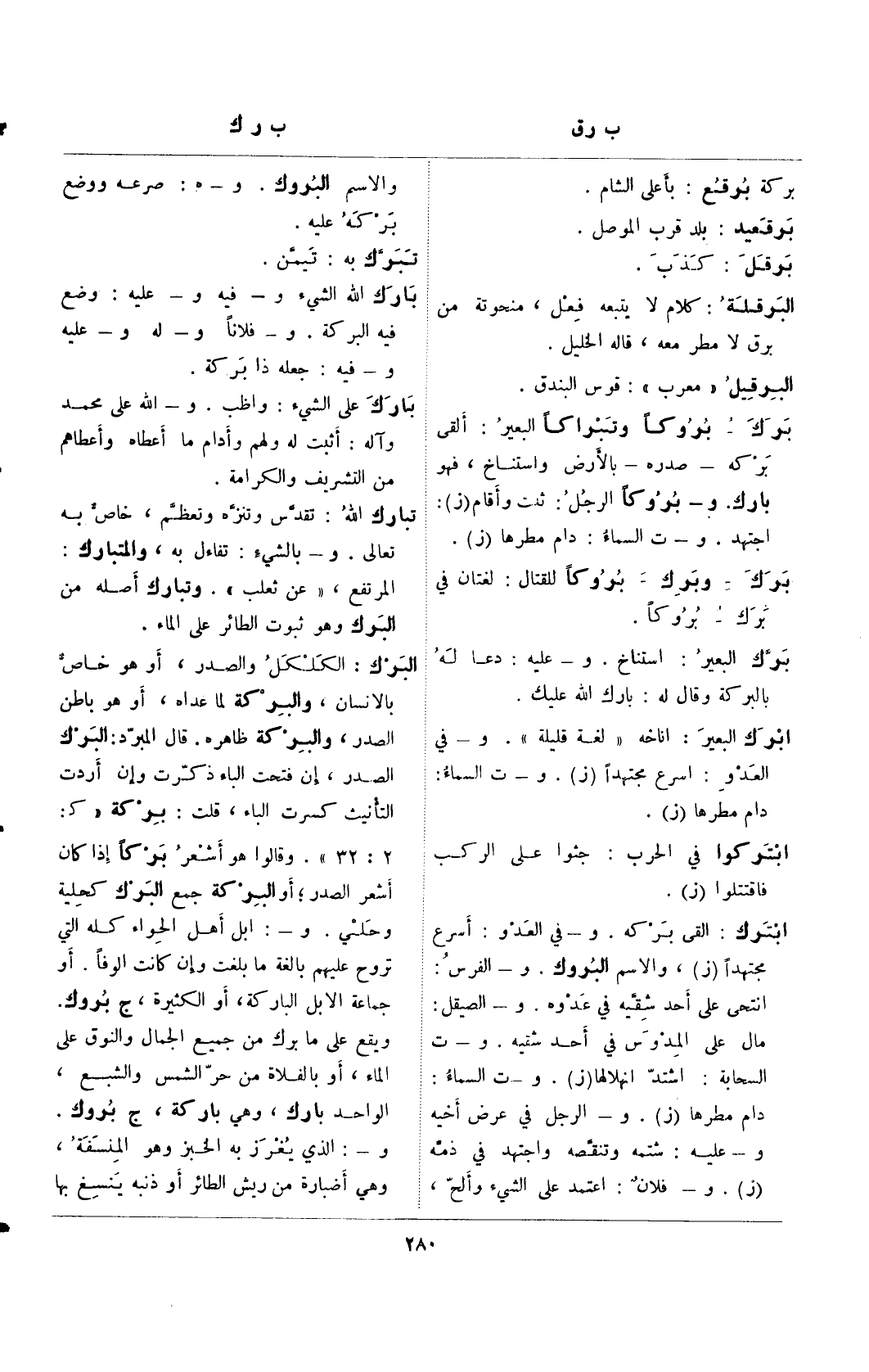 برك بروكا وتبراكا البعير: ألقى بركه –صدره- بالأرض واستناخ، فهو بارك. و- بروكا الرجل: ثبت وأقام (ز): اجتهد. و- ت السماء: دام مطرها (ز).