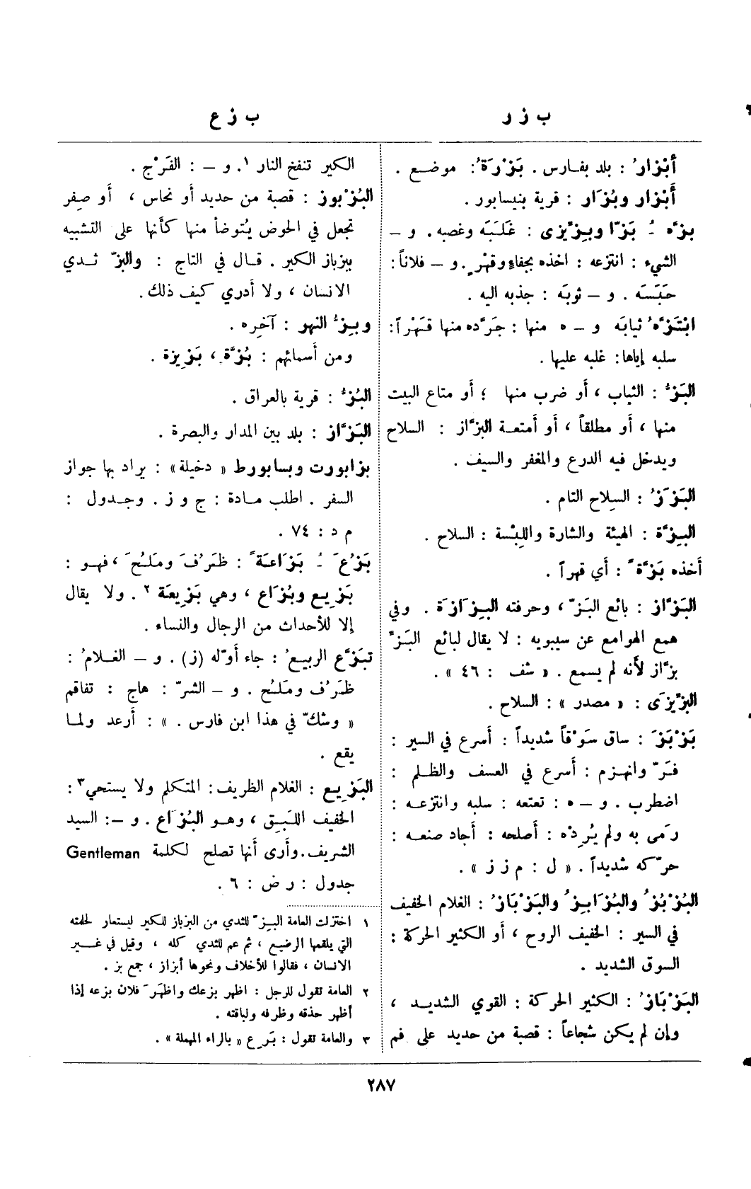 البزيع: الغلام الظريف: المتكلم ولا يستحي (¬3): الخفيف اللبق، وهو البزاع. و-: السيد الشريف. وأرى أنها تصلح لكلمة Gentleman جدول: رض: 6.