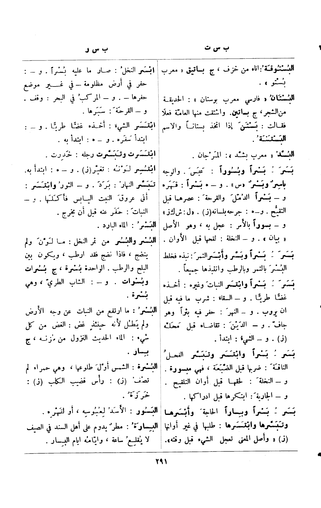 بسر- بسرًا وبسورًا: عبس. والوجه باسر وبسر "س". و-هـ بسرًا: قهره و- بسرًا الدمل والقرحة: عصرهما قبل التقيح. و-هـ: جرحه بلسانه (ز). "ل: ش ك ر" و- بسورًا بالأمر: عجل بله، وهو الأصل "بيان". و- النخلة: لقحها قبل الأوان.