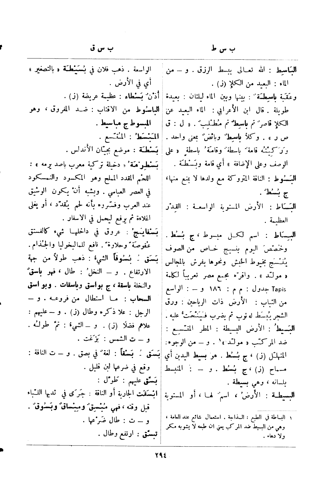البسيط: الأرض البسيطة: المطر المتسع: ضد المركب "مولد" (¬1). و- من الوجوه: المتهلل (ز)، ج بسط. هو بسيط اليدين أي مسماح (ز)، ج بسط. و-: المنبسط بلسانه، وهي بسيطة.