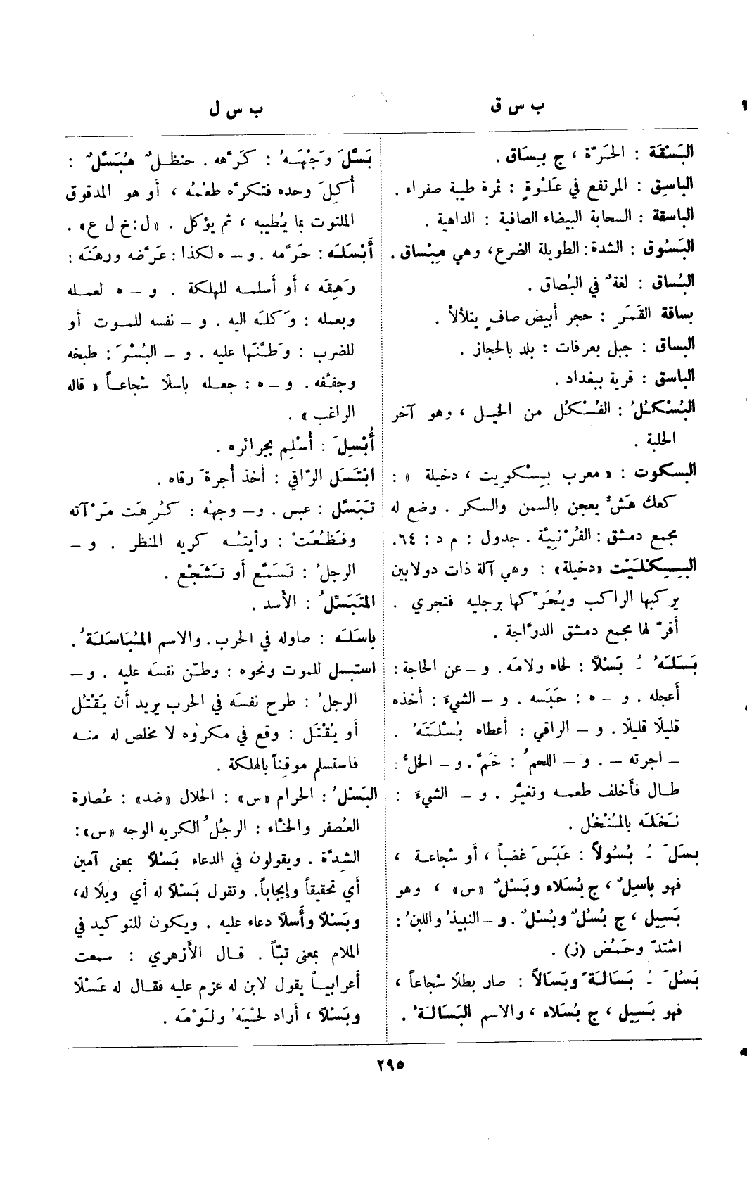 بسل وجهه: كرهه. حنظل مبسل: أكل وحده فتكره طعمه، أو هو المدقوق الملتوت بما يطيبه، ثم يؤكل. "ل: خ ل ع". أبسله: حرمه. و- هـ لكذا: عرضه ورهنه: رهقه، أو أسلمه للهلكة. و- هـ لعمله بعمله: وكله إليه. و- نفسه للموت أو للضرب: وطنها عليه. و- البسر: طبخه وجففه. و-هـ: جعله باسلًا شجاعًا "قاله الراغب".