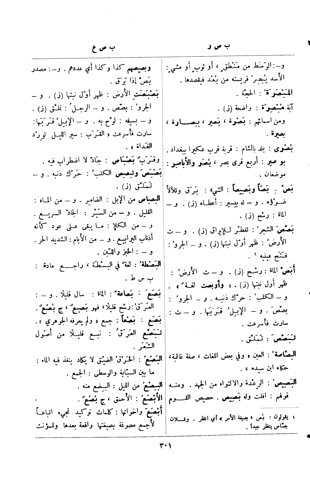(¬1) يقولون: بُص "بصيغة الأمر" أي أنظر. وفلان بصاص ينظر جيدًا.