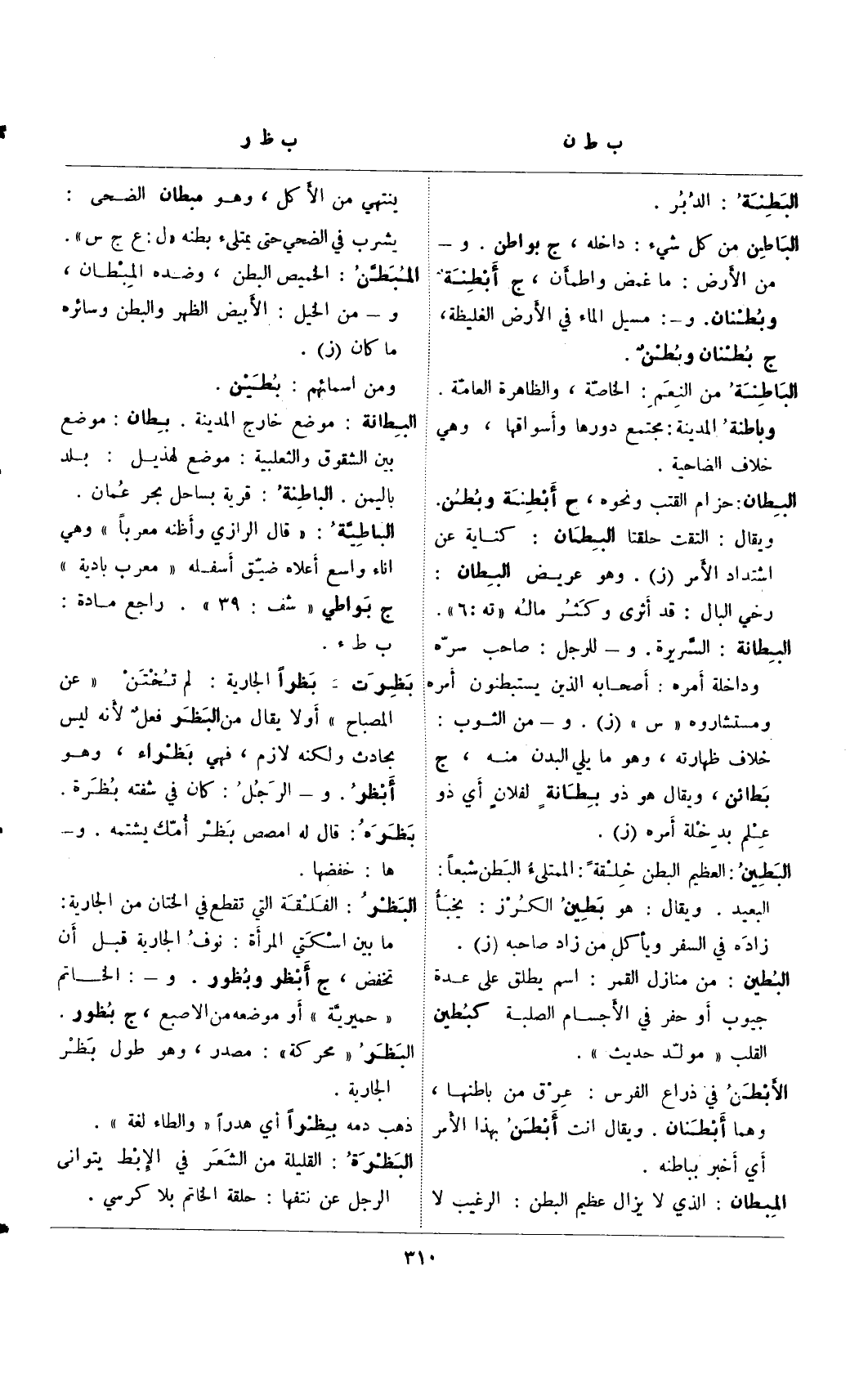 الباطن من كل شيء: داخله، ج بواطن. و- من الأرض: ما غمض واطمأن، ج أبطنة وبطنان. و-: مسيل الماء في الأرض الغليظة، ج بطنان وبطن.