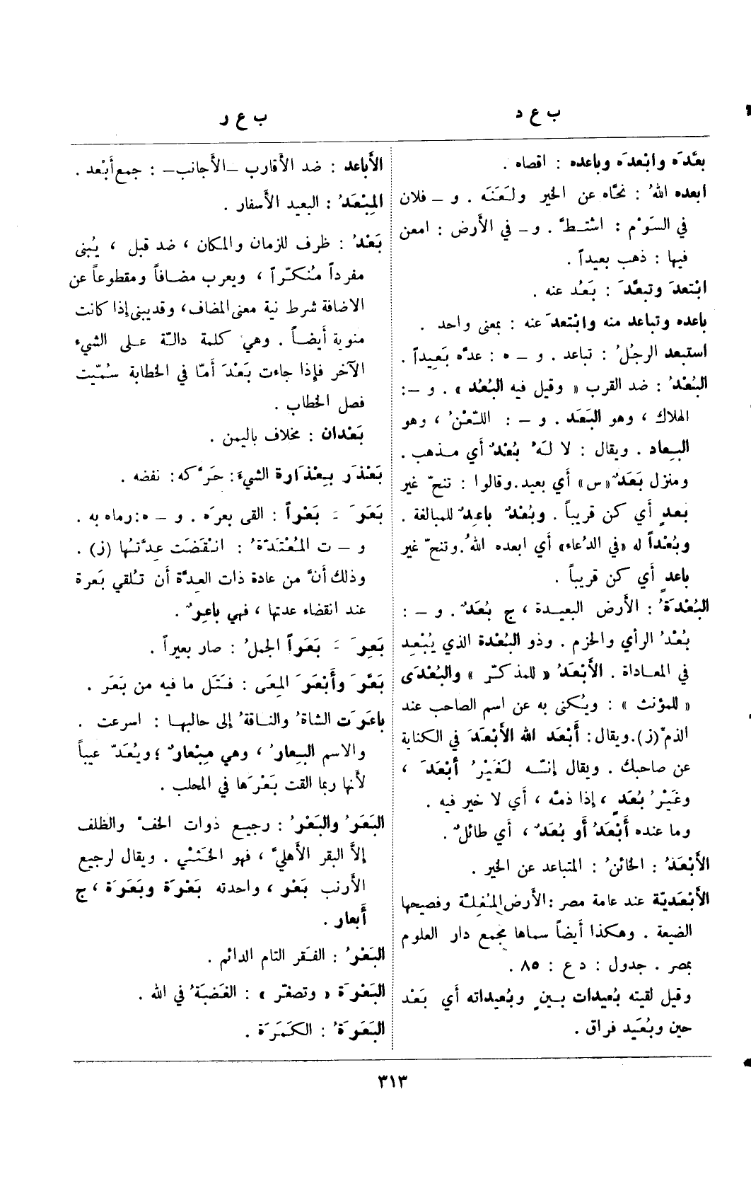 البعد: ضد القرب "وقيل فيه البعد". و-: الهلاك، وهو البعد. و-: اللعن، وهو البعاد. ويقال: لا له بُعدٌ أي مذهب. ومنزل بُعدٌ "س" أي بعيد. وقالوا: تنح غير بعدٍ أي كن قريبًا. وبُعدٌ باعدٌ للمبالغة. وبُعدًا له "في الدعاء" أي أبعده الله. وتنح غير باعدٍ أي كن قريبًا.