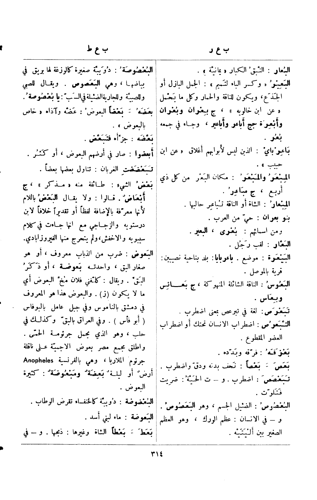 البعوض: ضرب من الذباب معروف، أو هو صغار البق، واحدته بعوضة، أو ذكر البق. ويقال: كلفني فلان مخ البعوض أي ما لا يكون (ز). والبعوض هذا هو المعروف في دمشق بالناموس وفي جبل عامل بالبوفاس (أبو فاس). وفي العراق بالبق وكذلك في حلب، وهو الذي يحمل جرثومة الحمى. وأطلق مجمع مصر بعوضة الأجمية على ناقلة جرثومة الملاريا، وهي بالفرنسية Anopheles أرضٌ أو ليلةٌ بعضةٌ ومبعوضة: كثيرة البعوض.