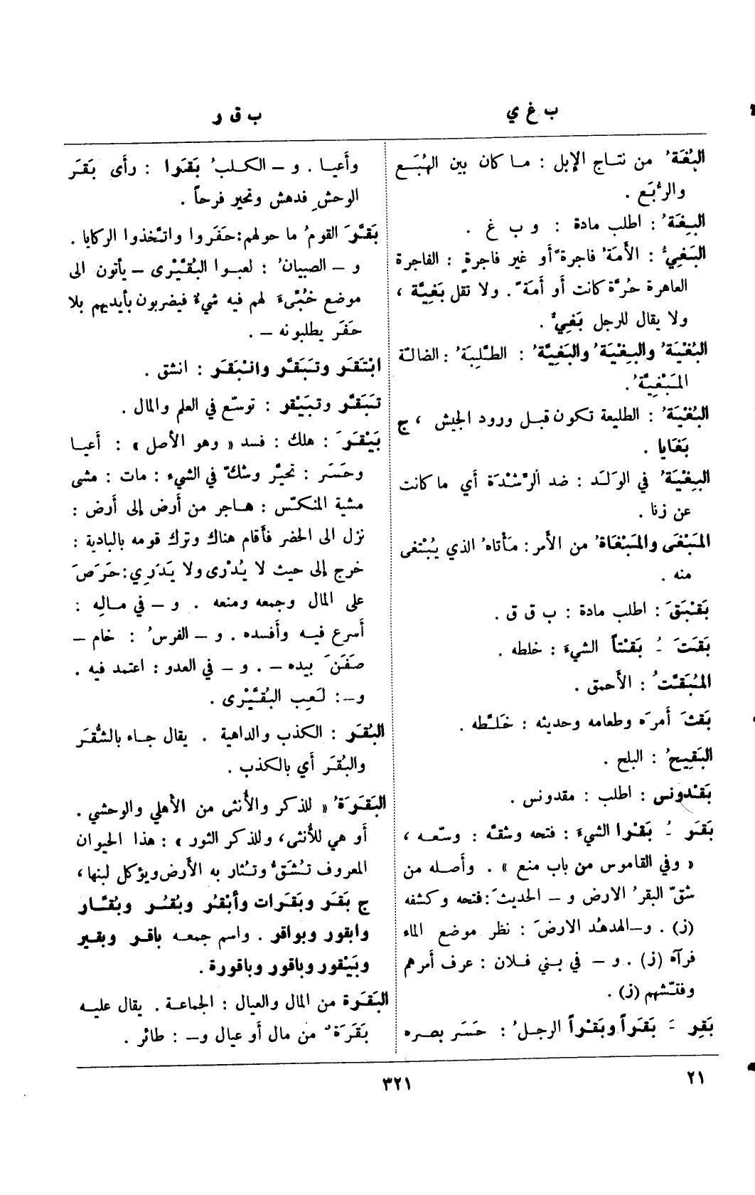البقرة "للذكر والأنثى من الأهلي والوحشي. أو هي للأنثى، وللذكر الثور": هذا الحيوان المعروف تشق وتثار به الأرض ويؤكل لبنها، ج بقر وبقرات وأبقر وبقر وبقار وأبقور وبواقر. واسم جمعه باقر وبقير وبيقور وباقور وباقورة.