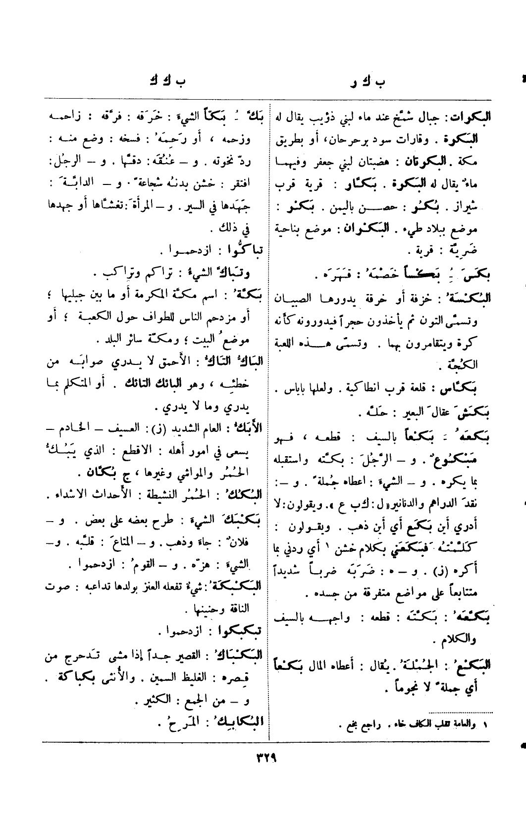 بك – بكًا الشيء: خرقه: فرقه: زاحمه وزحمه، أو رحمه: فسخه: وضع منه: رد نخوته. و- عنقه: دقها. و- الرجل: افتقر: خشن بدنه شجاعة. و- الدابةك جهدها في السير. و- المرأة: تغشاها أو جهدها في ذلك.