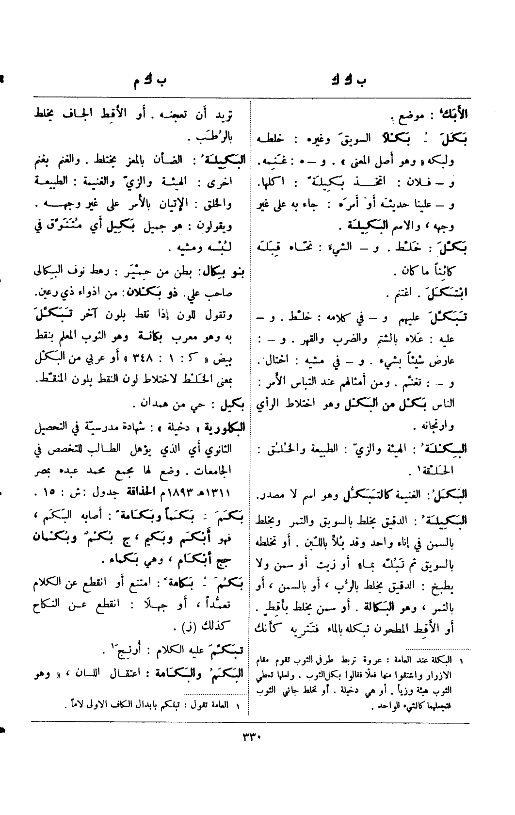 بكل – بكلًا السويق وغيره: خلطه ولبكه "وهو أصل المعنى". و-هـ: غنمه. و- فلان: اتخذ بكيلة: أكلها.