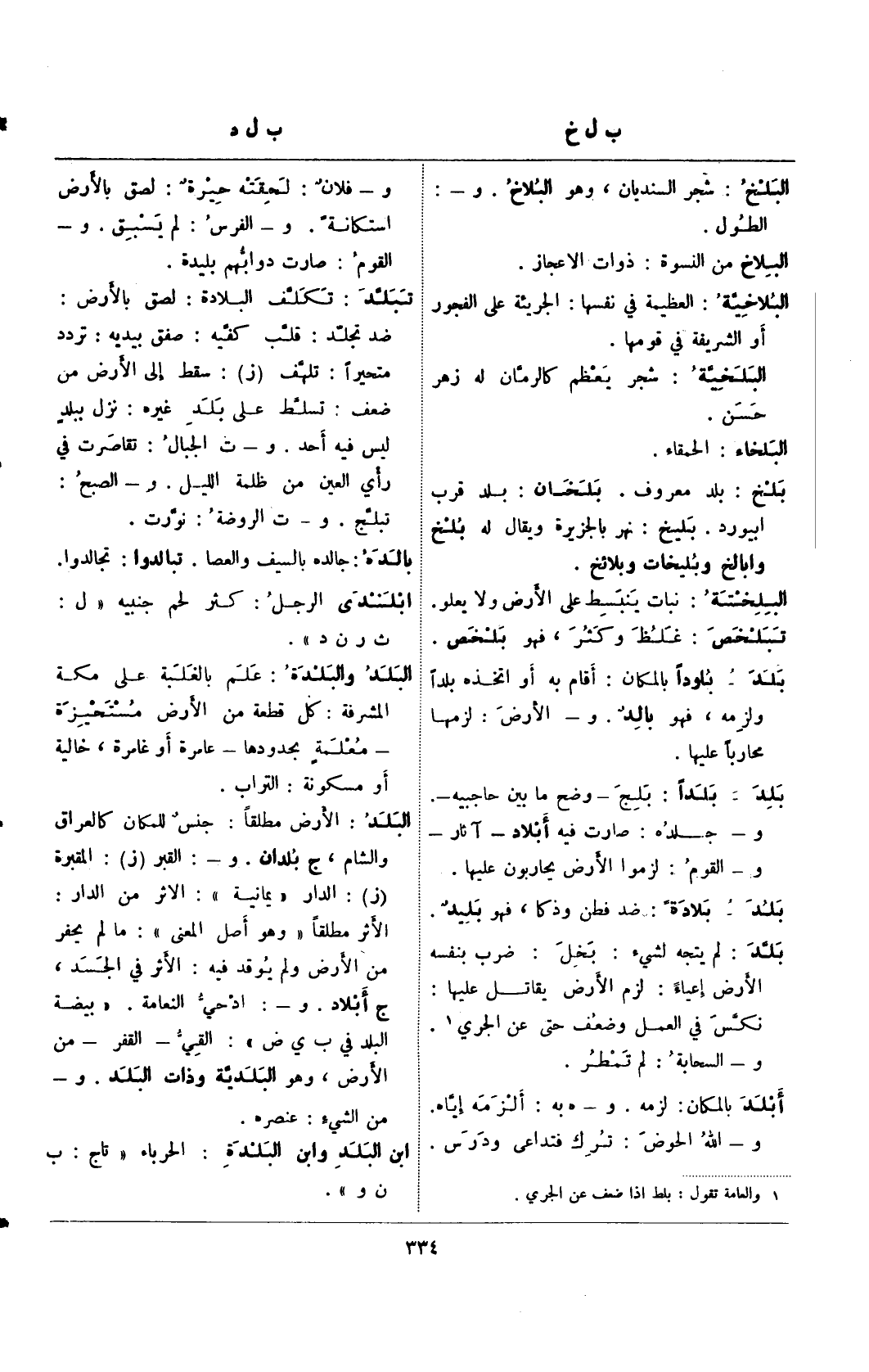 بلد- بلادة: ضد فطن وذكا، فهو بليد. بلد: لم يتجه لشيء: بخل: ضرب بنفسه الأرض إعياء: لزم الأرض يقاتل عليها نكس في العمل وضعف حتى عن الجري (¬1).