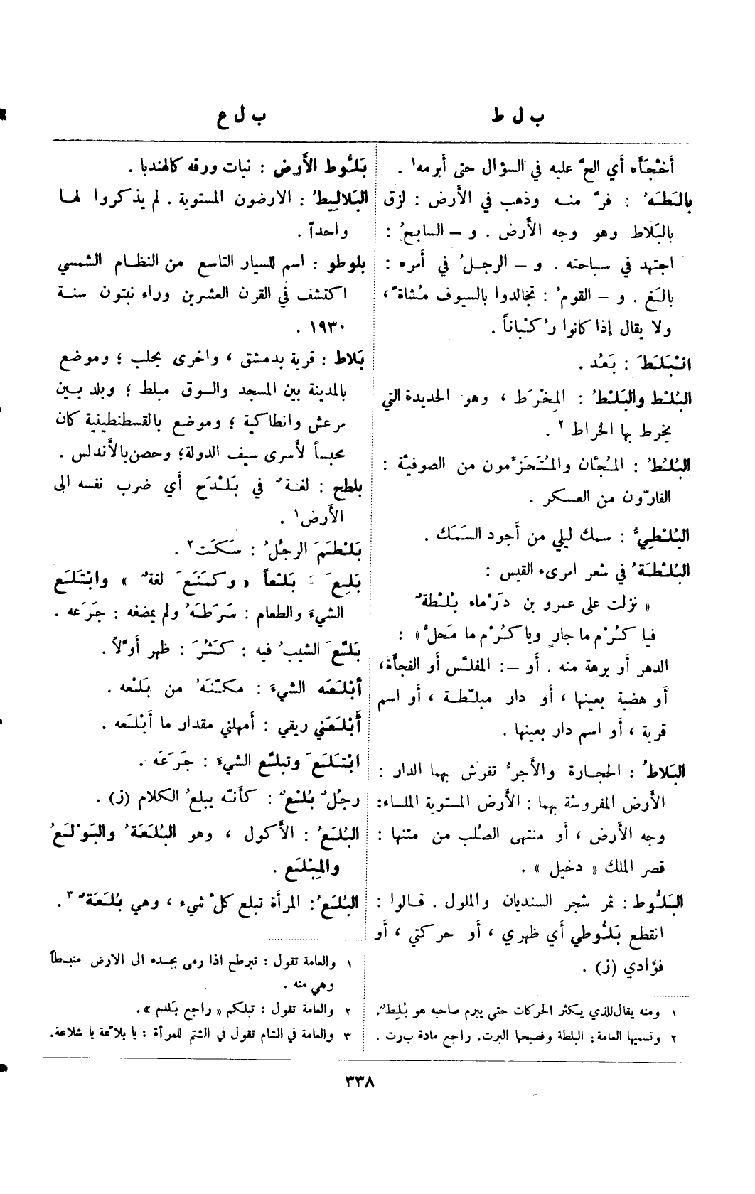 بالطه: فر منه وذهب في الأرض: لزق بالبلاط وهو وجه الأرض. و- السابح: اجتهد في سباحته. و- الرجل في أمره: بالغ. و- القوم: تجالدوا بالسيوف مشاة، ولا يقال إذا كانوا ركبانًا.