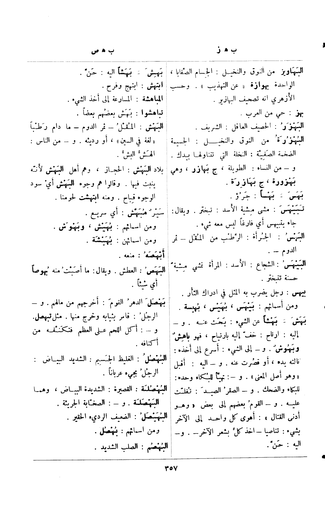 و- من النساء: الطويلة، ج بهارز، وهي بهزورة، ج بهازرة.