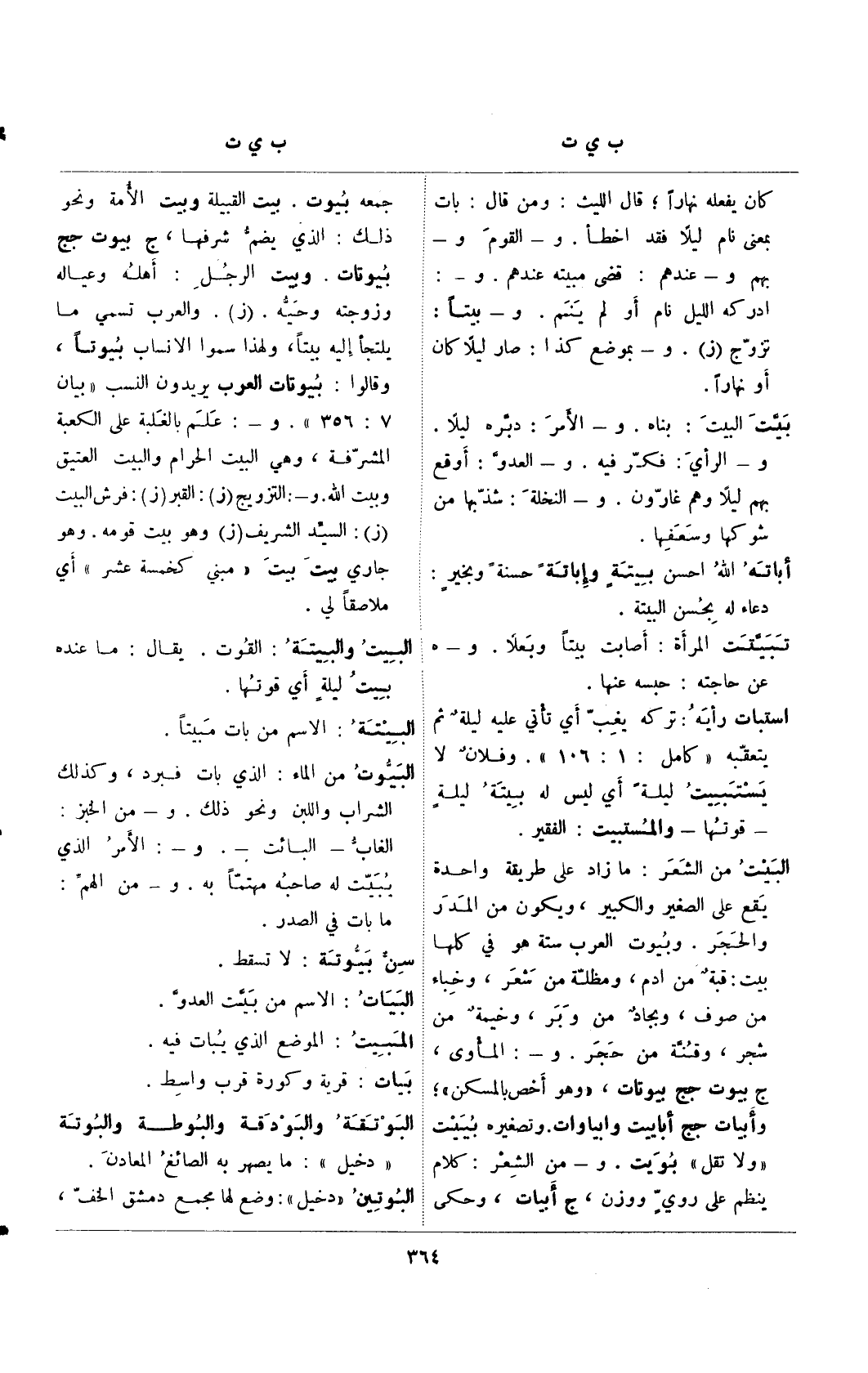 جمعه بيوت. بيت القبيلة وبيت الأمة ونحو ذلك: الذي يضم شرفها، ج بيوت ج بيوتات. وبيت الرجل: أهله وعياله وزوجته وحيه. (ز). والعرب تسمي ما يلتجأ إليه بيتًا، ولهذا سموا الانساب بيوتًا، وقالوا: بيوتات العرب يريدون النسب "بيان 7: 356". و-: علم بالغلبة على الكعبة المشرفة، وهي البيت الحرام والبيت العتيق وبيت الله. و-: التزويج (ز): القبر (ز): فرش البيت (ز): السيد الشريف (ز) وهو بيت قومه. وهو جاري بيت بيت "مبني كخمسة عشر" أي ملاصقا لي.