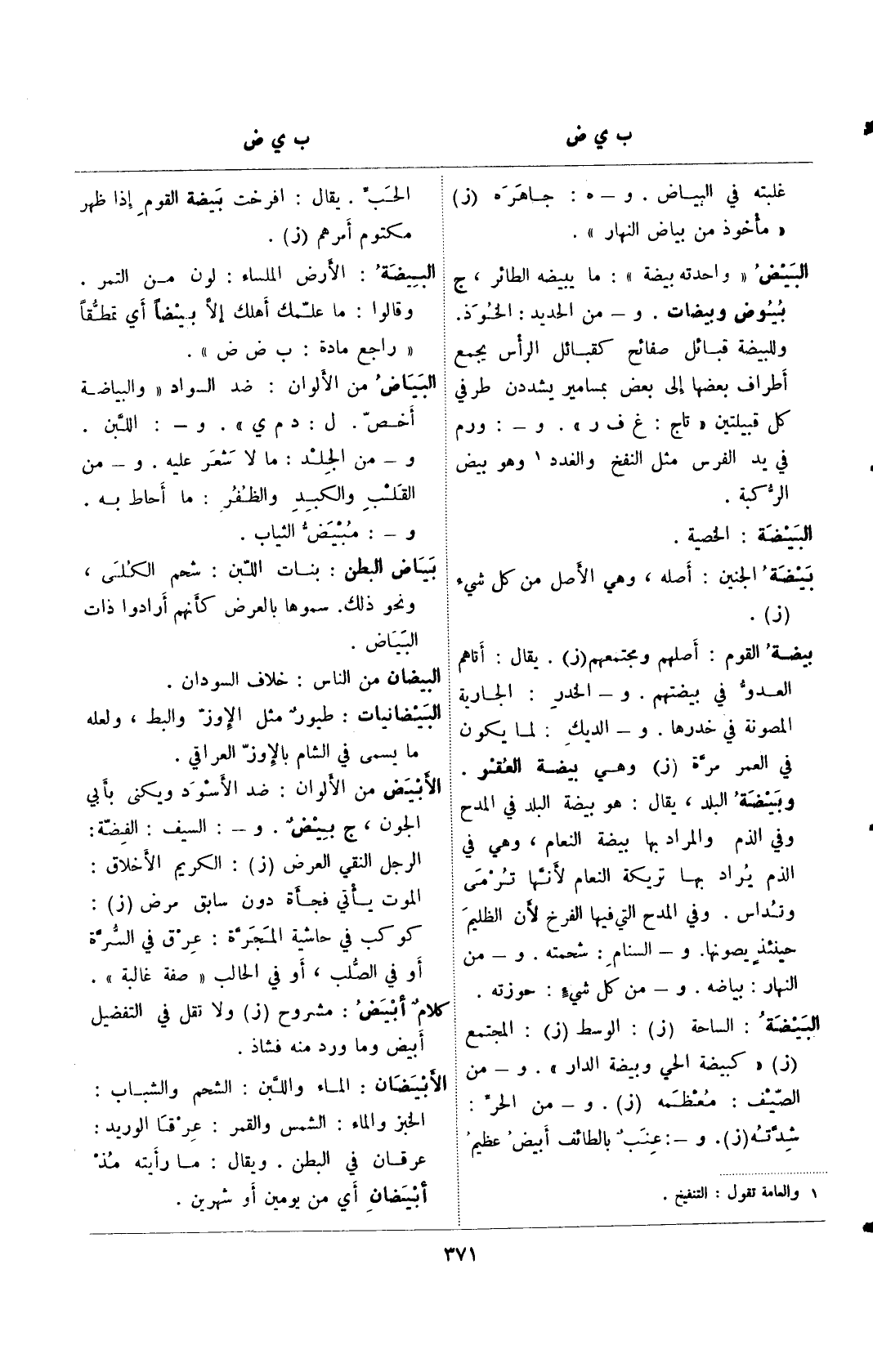 البياض من الألوان: ضد السواد "والبياضة اخص. ل: د م ي". و-: اللبن. و- من الجلد: ما لا شعر عليه. و- من القلب والكبد والظفر: ما أحاط به. و-: مبيض الثياب.