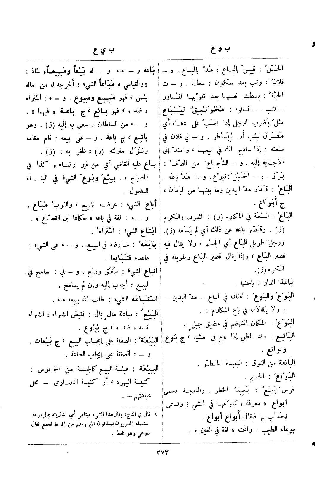 باعه و- منه و- له بيعًا ومبيعًا "شاذ" "والقياسي" مباعا الشيء: أخرجه له من ماله بثمن، فهو مبيع ومبيوع. و- هـ: اشتراه "ضد"، فهو بائع، ج باعة "فيهما". و- هـ من السلطان: سعى به إليه (ز). وهو بائع، ج باعة. و- على بيعه: قام مقامه ونزل منزلته (ز): ظفر به: (ز).
