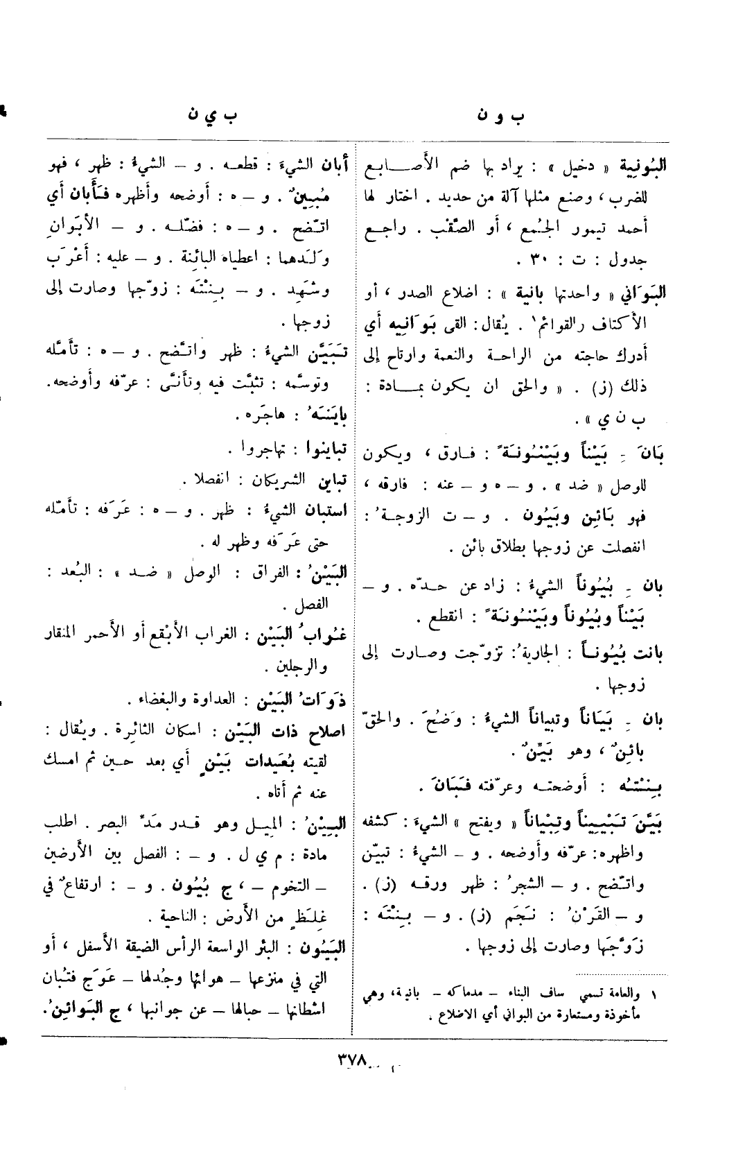 بان- بينًا وبينونة: فارق، ويكون للوصل "ضد". و- هـ و- عنه: فارقه، فهو بائن وبيون. و- ت الزوجة: انفصلت عن روجها بطلاق بائن.