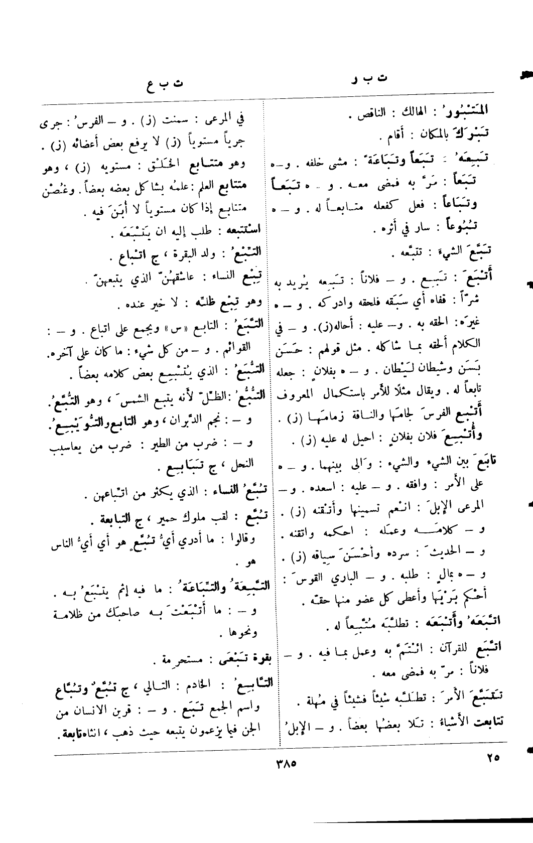 تبعه تبعا وتباعة: مشى خلفه. و- هـ تبعا: مر به فمضى معه. و- هـ تبعا وتباعا: فعل كفعله متابعا له. و- هـ تبوعا: سار في أثره.