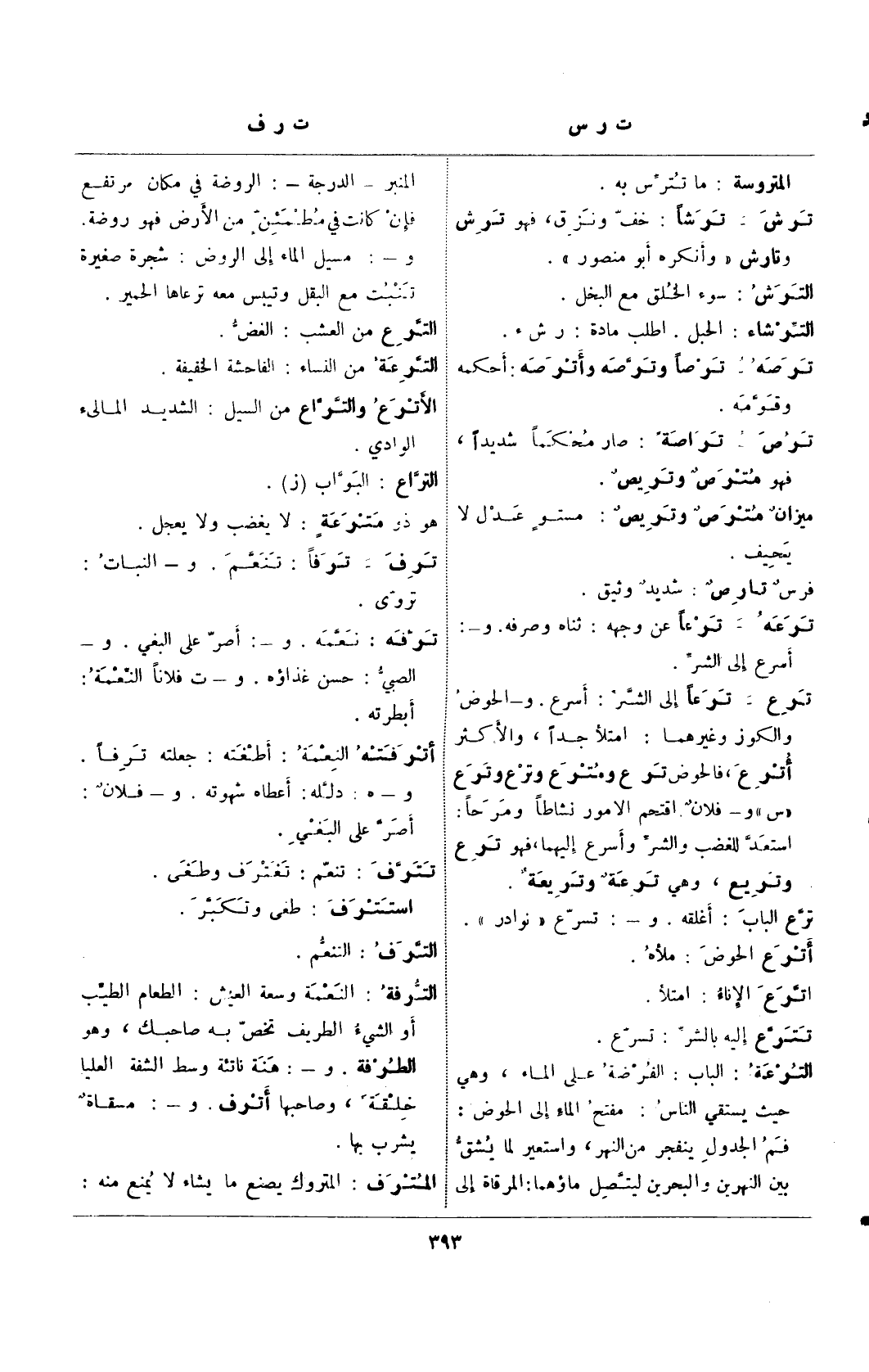ترع- ترعًا إلى الشر: أسرع. و- الحوض والكوز وغيرهما: امتلأ جدًا، والأكثر أترع، فالحوض ترع ومترع وترع وترع "س" و- فلان. اقتحم الأمور نشاطًا ومرحًا: استعد للغضب والشر وأسرع إليهما، فهو ترع وتريع، وهي ترعة وتريعة.