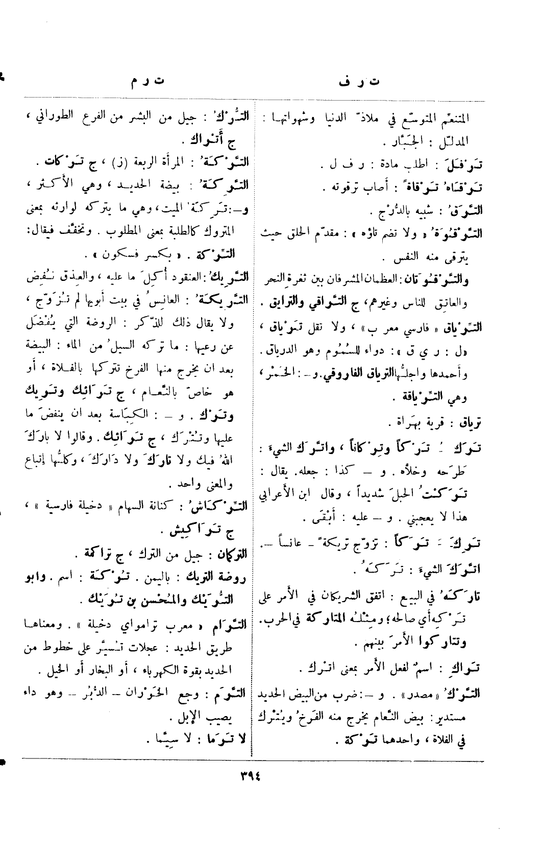 التريكة: العانس في بيت أبويها لم تزوج، ولا يقال ذلك للذكر: الروضة التي يفضل عن رعيها: ما تركه السيل في الماء: البيضة بعد أن يخرج منها الفرخ تتركها بالفلاة، أو هو خاص بالنعام، ج ترائك وتريك وترك. و-: الكباسة بعد أن ينفض ما عليها وتترك، ج ترائك. وقالوا لا بارك الله فيك ولا تارك ولا دارك، وكلها إتباع والمعنى واحد.