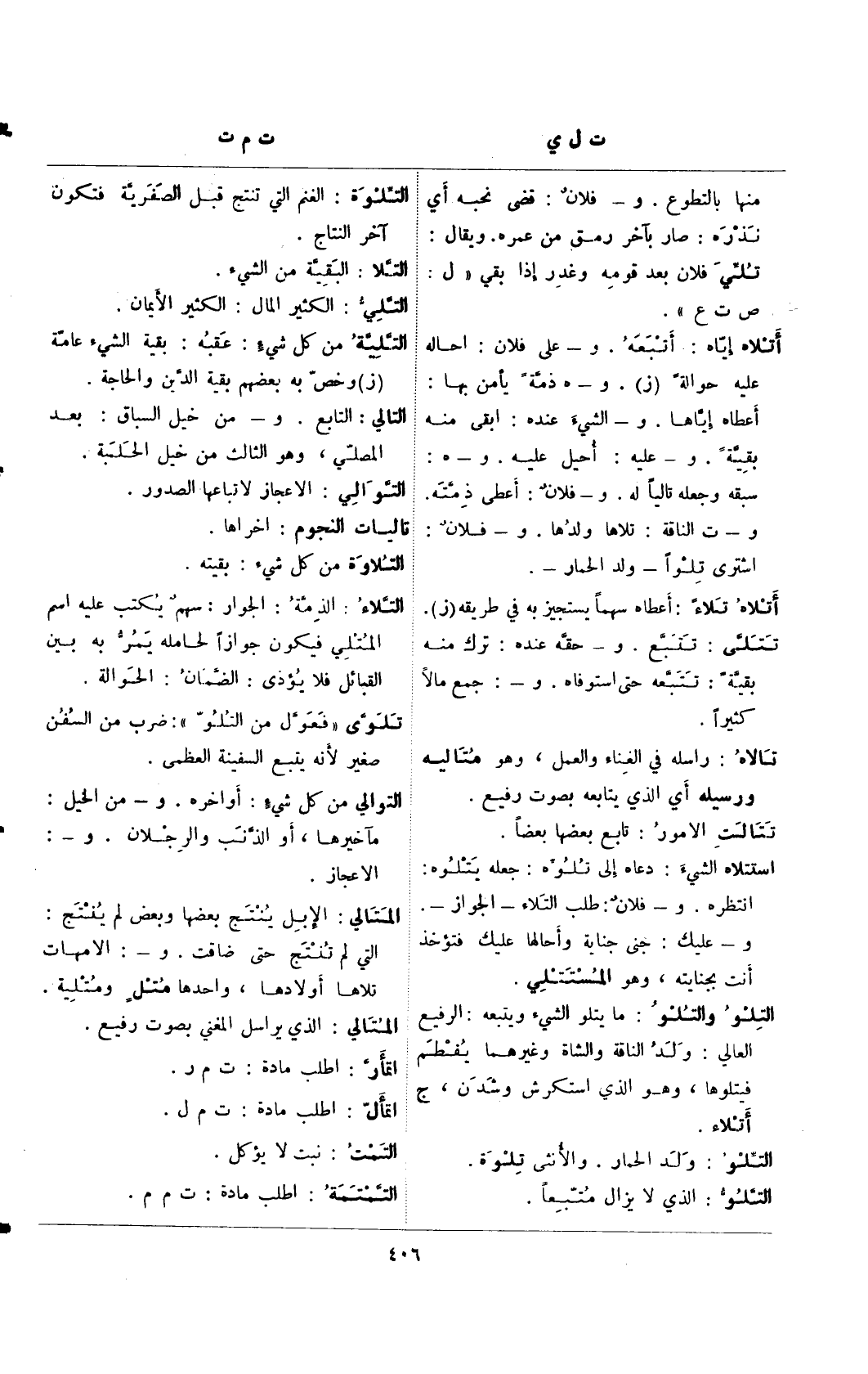 المتالي: الإبل ينتج بعضها وبعض لم ينتج: التي لم تنتج حتى ضاقت. و-: الأمهات تلاها أولادها، واحدها متل ومتلية.