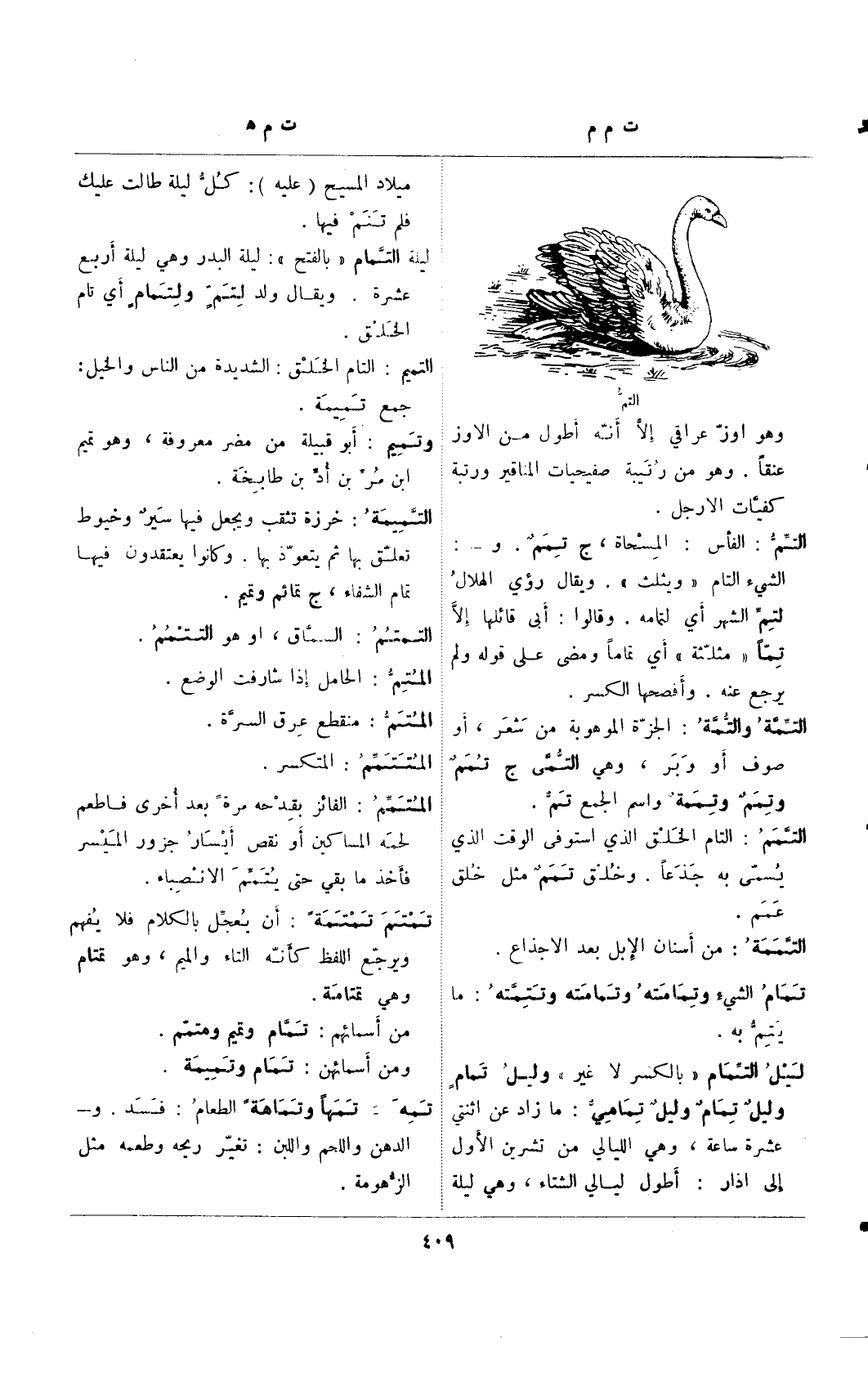 التم: الفأس: المسحاة، ج تمم. و-: الشئ التام "ويثلث". ويقال رؤي الهلال لتم الشهر أي لتمامه. وقالوا: أبي قائلها إلا تمًا "مثلثة"أي تمامًا ومضى على قوله ولم يرجع عنه. وأفصحها الكسر.