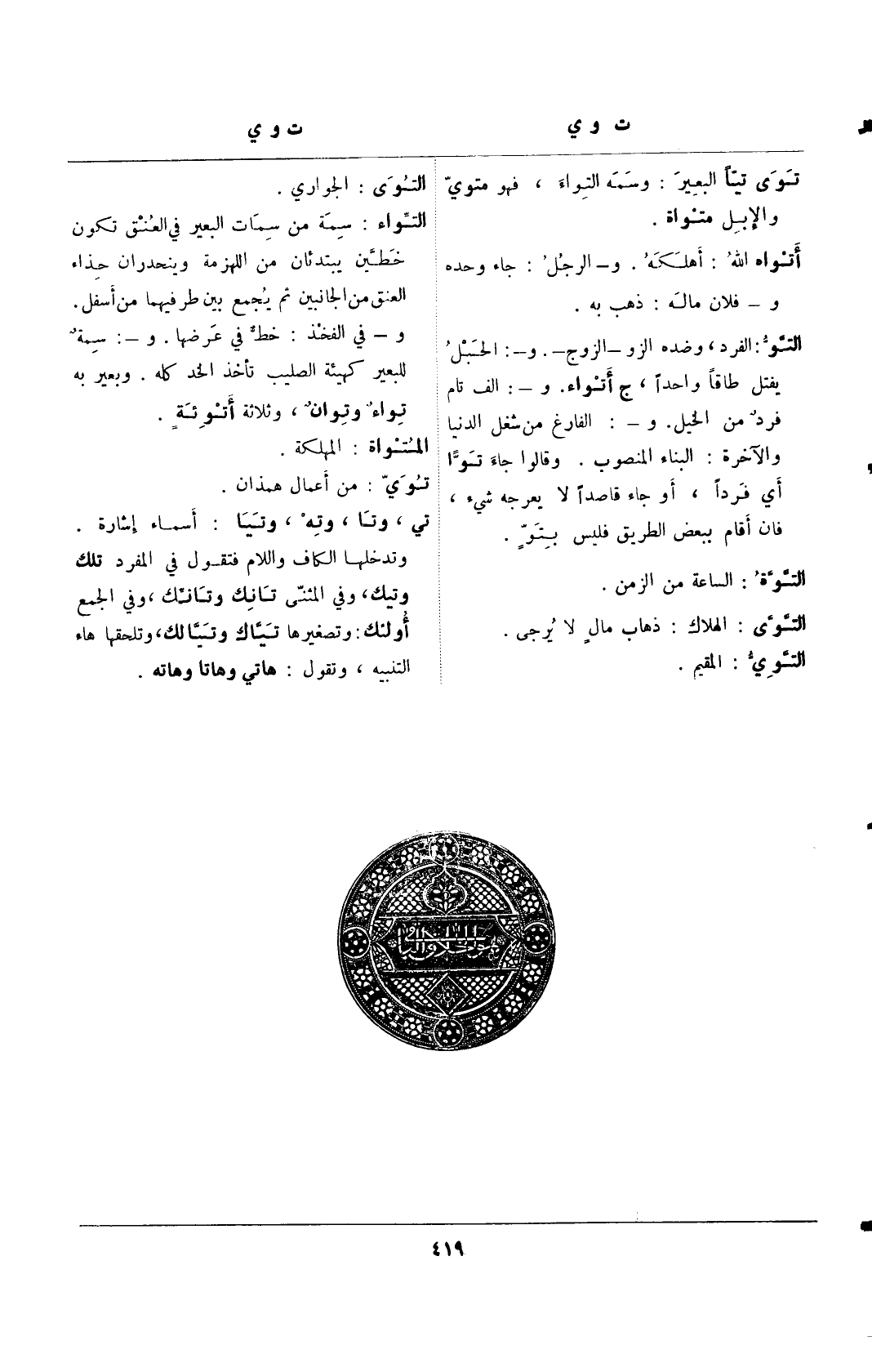 توى تيًا البعير: وسمه التواء: فهو متوي والإبل متواه.