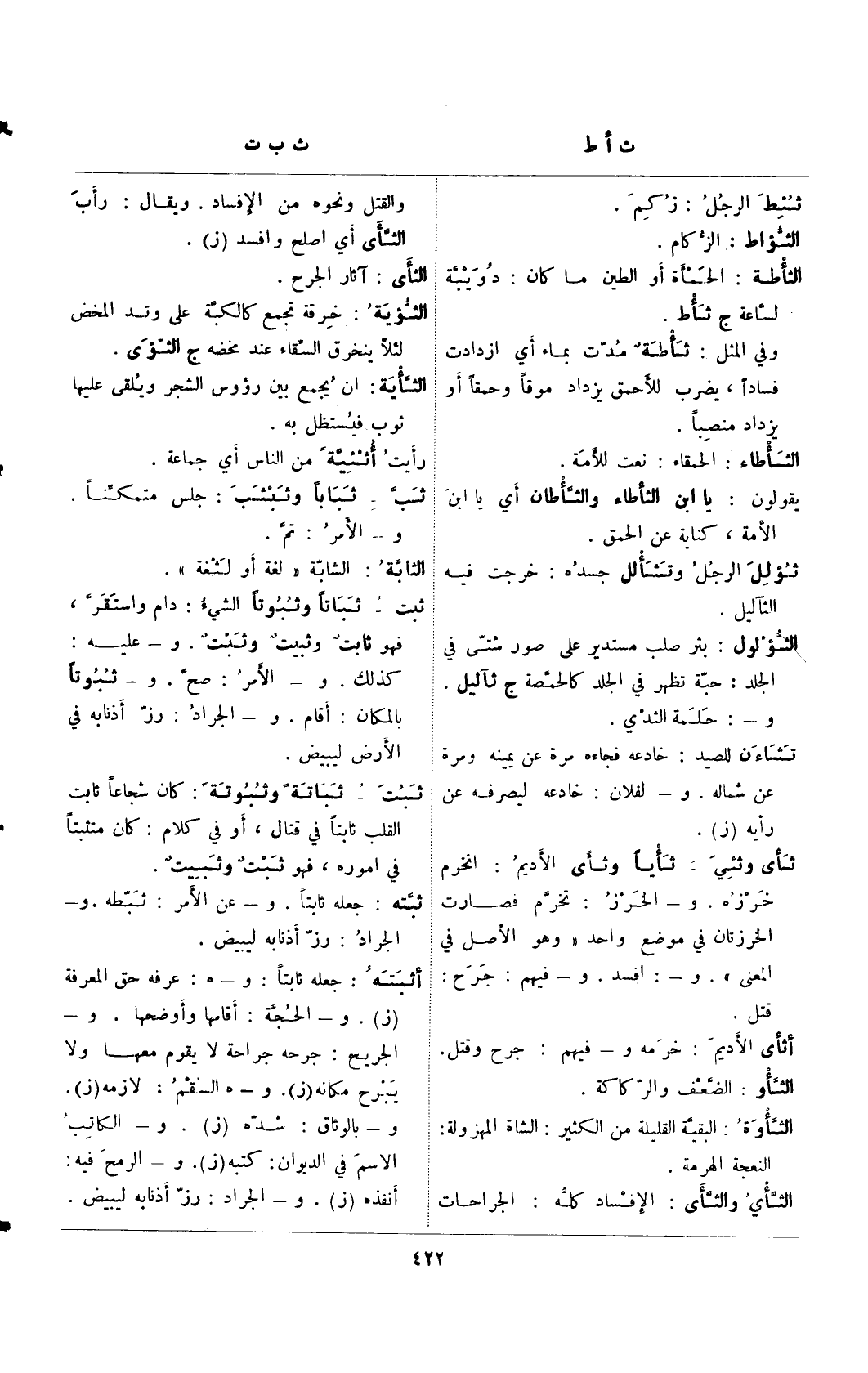 ثأى وثئي- ثأيا وثأي الأديم: انخرم خرزه. و- الخرز: تخرم فصارت الخرزتان في موضع واحد "وهو الأصل في المعنى". و-: افسد. و-: فيهم: جرح: قتل.