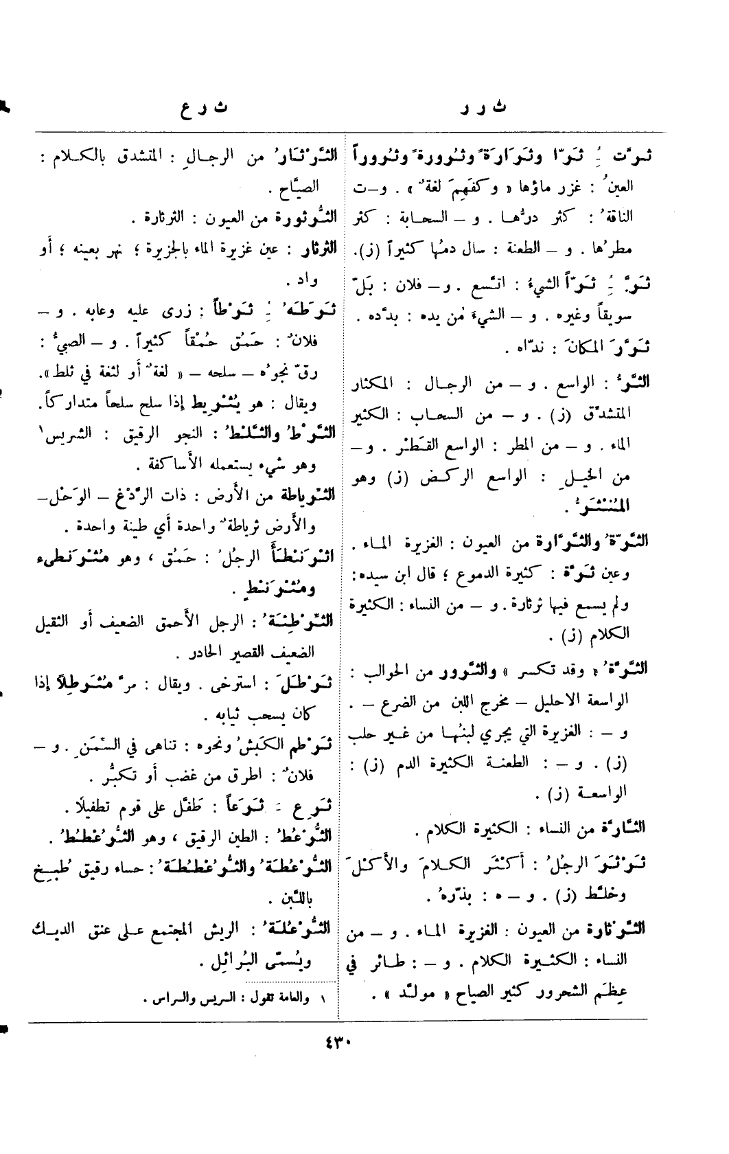 ثرت- ثرا وثرارة وثرورة وثرورًا العين: غزر ماؤها "وكفهم لغة". و- ت الناقة: كثر درها. و- السحابة: كثر مطرها. و- الطعنة: سال دمها كثيرًا (ز).