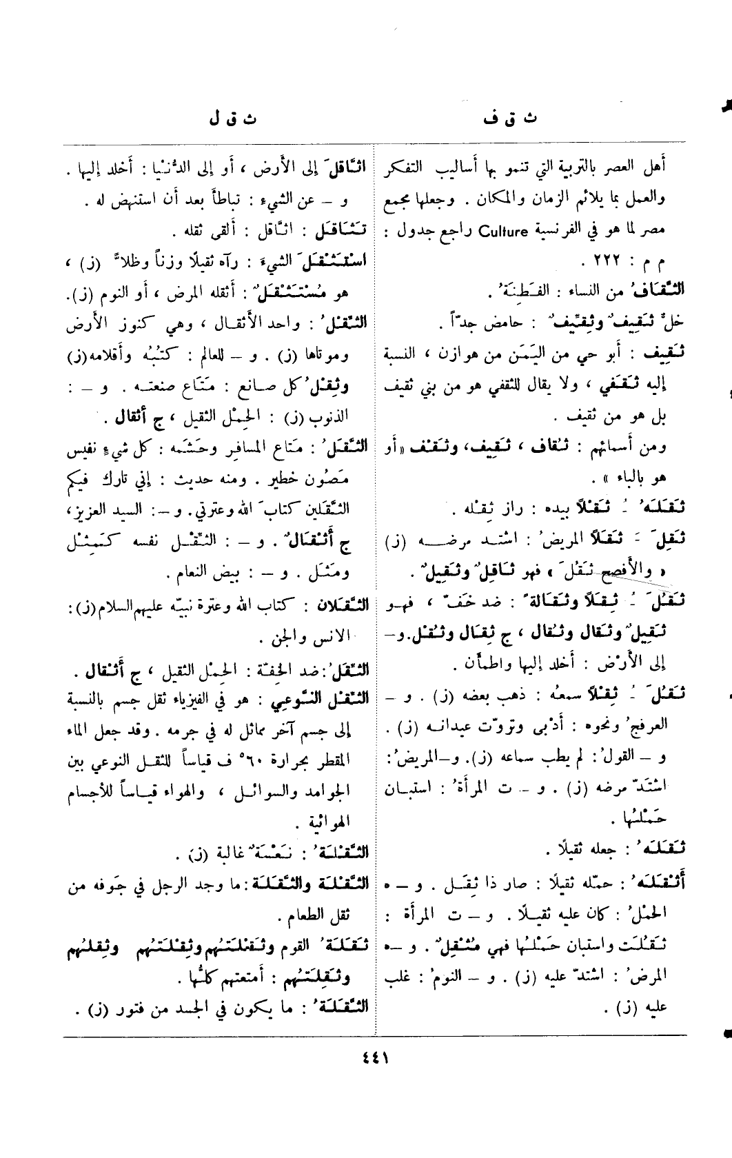 استثقل الشيء: رآه ثقيلًا وزنًا وظلًا (ز)، هو مستثقل: أثقله المرض، أو النوم (ز). الثقل: واحد الأثقال، وهي كنوز الأرض وموتاها (ز). و- للعالم: كتبه وأقلامه (ز) وثقل كل صانع: متاع صنعته. و-: الذنوب (ز): الحمل الثقيل، ج أثقال.