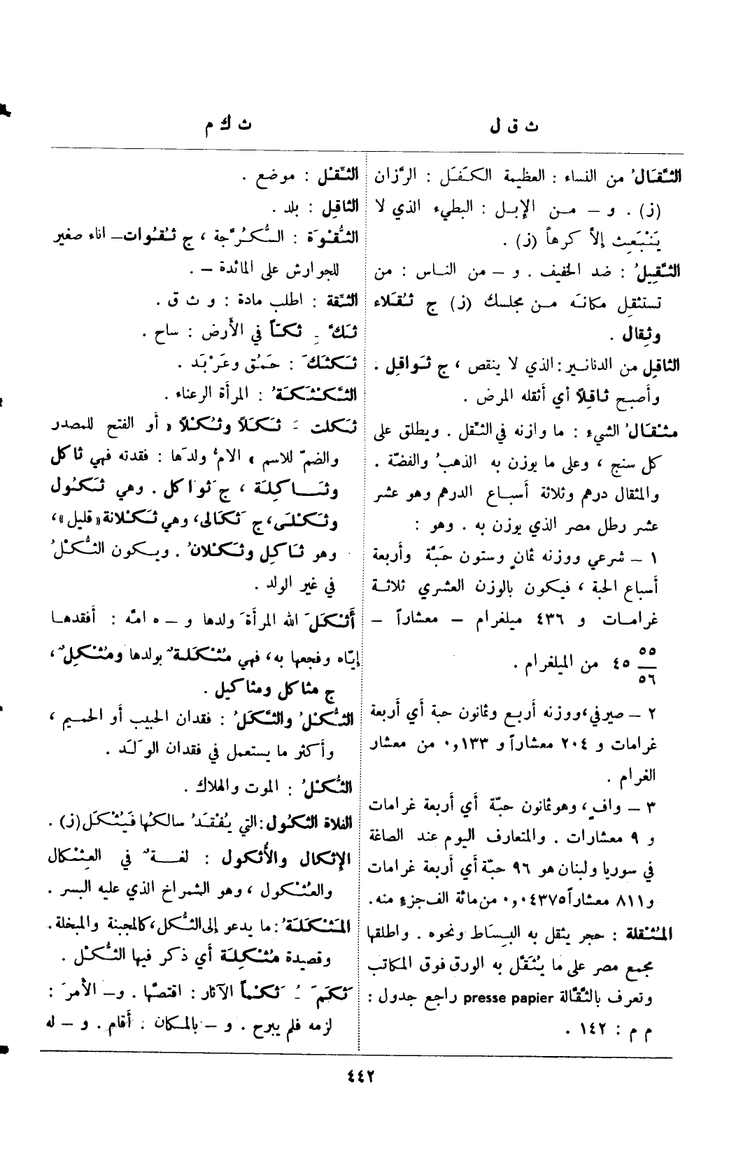 المثقلة: حجر يثقل به البساط ونحوه. وأطلقها مجمع مصر على ما يثقل به الورق فوق المكاتب وتعرف بالثقالة presse papier راجع جدول: م م: 142.