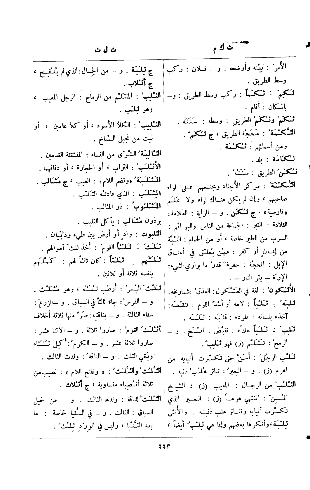 و- الفرس: جاء ثالثًا في السباق. و- الزرع: سقاه الثالثة. و- بناقته: صر مكنها ثلاثة أخلاف أثلث القوم: صاروا ثلاثة. و- الاثنا عشر: صاروا ثلاثة عشر. و- الكرم: أكل ثلثاه وبقي الثلث. و- الناقة: ولدت الثالث.