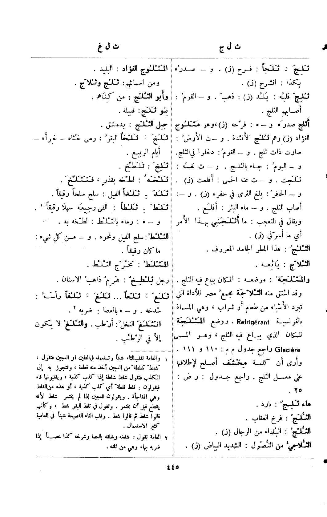 وقد اشتق منه الثلاجة مجمع مصر للأداة التي تبرد الأشياء من طعام أو شراب، وهي المسماة بالفرنسية Refrigerant. ووضع المثلجة للمكان الذي يباع فيه الثلج، وهو المسمى Glaciere راجع جدول م م: 110 و 111. وأرى أن كلمة مخشف أصلح لإطلاقها على معمل الثلج. راجع جدول: ر ض: 25.