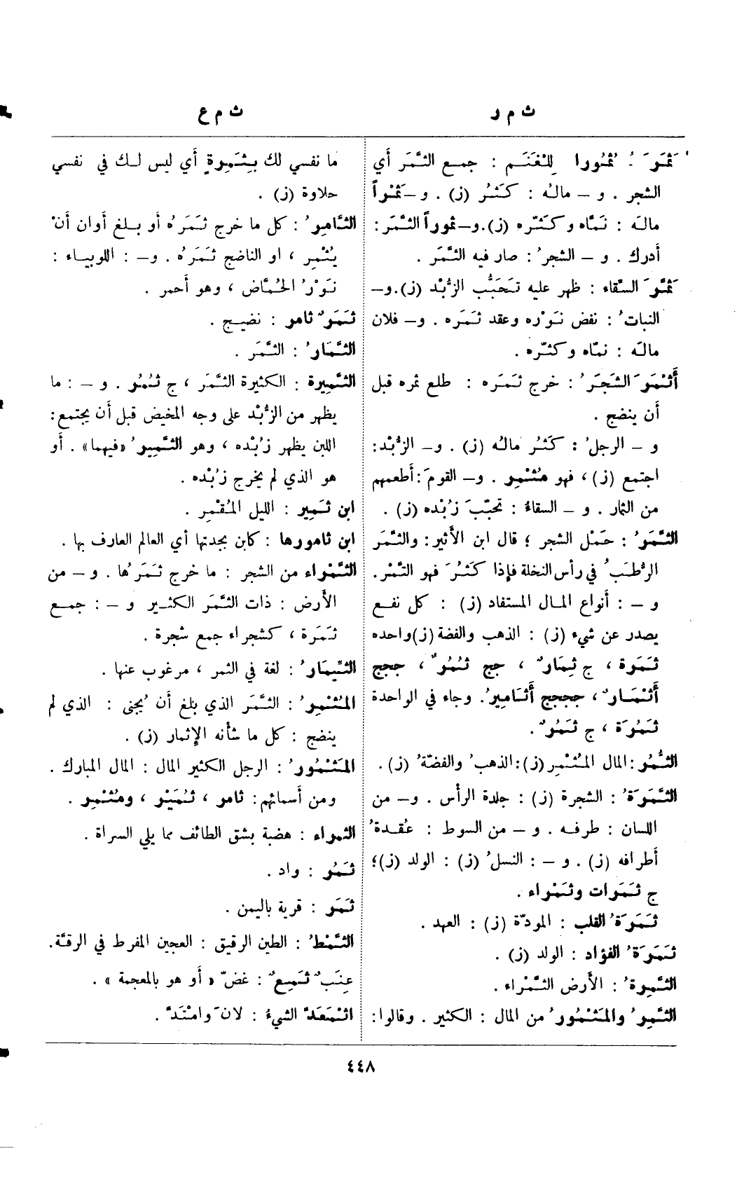 و-: أنواع المال المستفاد (ز): كل نفع يصدر عن شيء (ز): الذهب والفضة (ز) واحده ثمرة، ج ثمار، جج ثمر، ججج أثمار، جججج أثامير. وجاء في الواحدة ثمرة، ج ثمر.