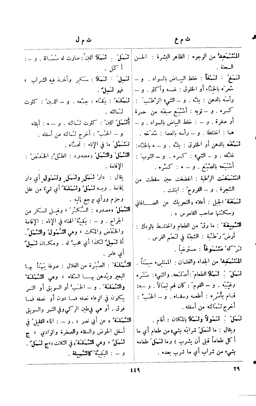 الثمل "مصدر": الكسر، وقيل السكر من الجراح. و-: بقية الهناء في الإناء: الإقامة والخفض والمكث، وهي الثمول واليم أنا ثمل لكذا أي محب له. ومكان ثمل أي عامر.