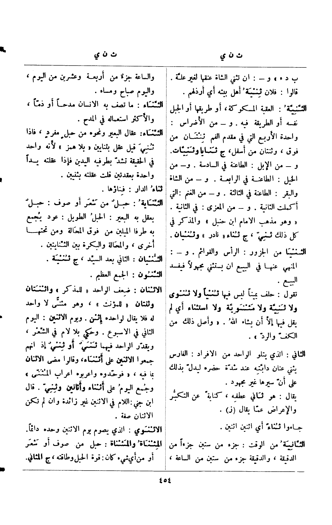 الثنية: العقبة المسكوكة، أو طريقها أو الجبل نفسه أو الطريقة فيه. و- من الأضراس: واحدة الأربع التي في مقدم الفم ثنتان من فوق، وثنتان من أسفل، ج ثنايا وثنيات. و- من الإبل: الطاعنة في السادسة. و- من الخيل: الطاعنة في الثالثة. و- من الغنم: التي أكملت الثانية. و- من المعزى: في الثانية. "وهو مذهب الإمام ابن حنبل" والمذكر في كل ذلك ثني، ج ثناء "نادر" وثنيان. الثنيا من الجزور: الرأس والقوائم. و-: المنهي عنها في البيع أن يستثنى مجهولًا فيفسد البيع.