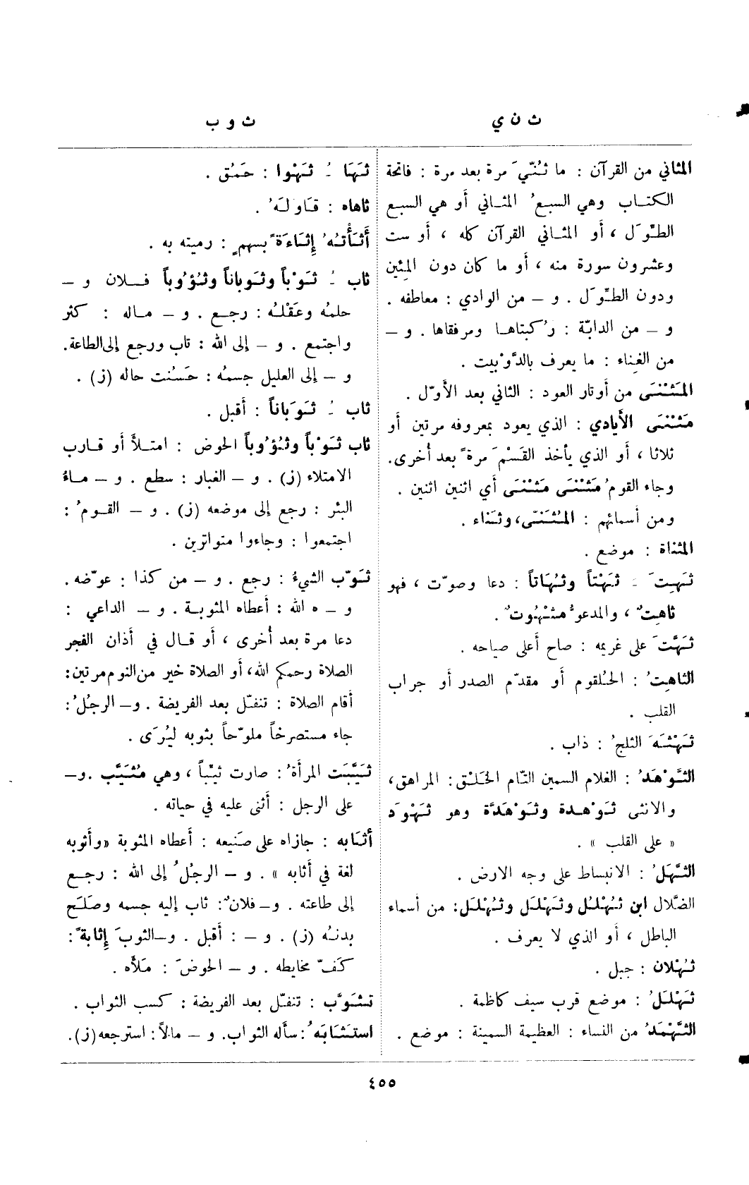 المثاني من القرآن: ما ثني مرة بعد مرة: فاتحة الكتاب وهي السبع المثاني أو هي السبع الطول، أو المثاني القرآن كله، أو ست وعشرون سورة منه، أو ما كان دون المئتين ودون الطول. و- من الوادي: معاطفه.