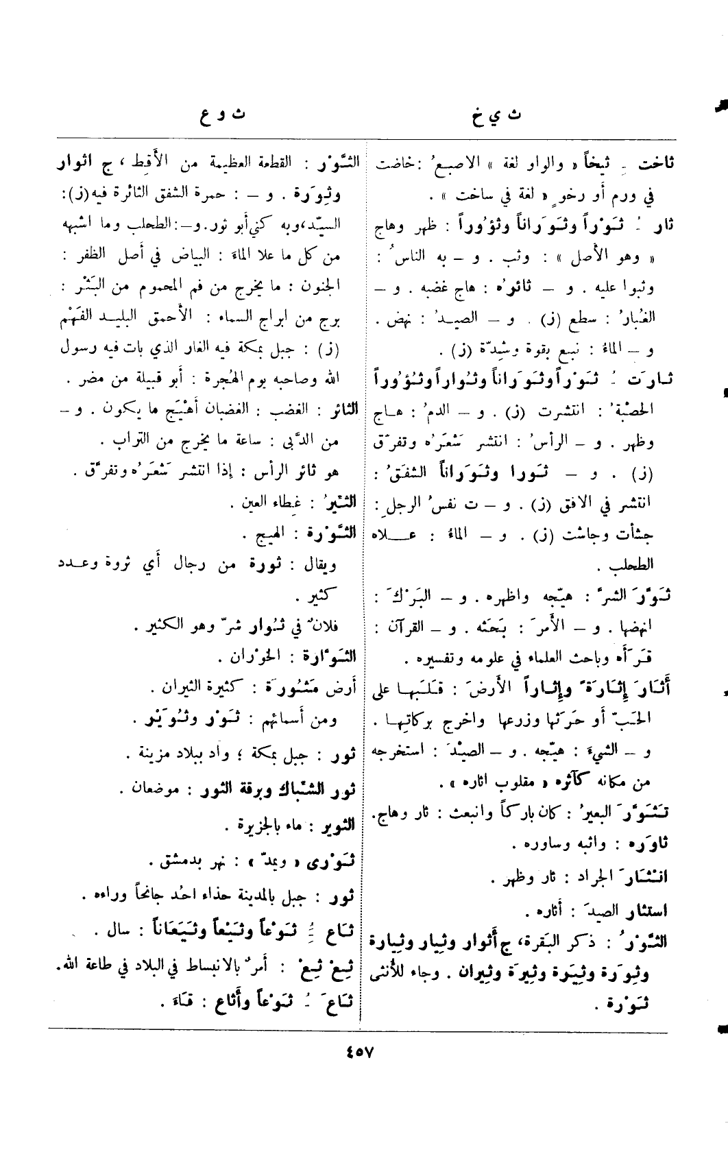 ثار – ثورًا وثورانًا وثؤورًا: ظهر وهاج "وهو الأصل": وثب. و- به الناس: وثبوا عليه. و- ثائره: هاج غضبه. و- الغبار: سطع (ز). و- الصيد: نهض. و- الماء: نبع بقوة وشدة (ز).