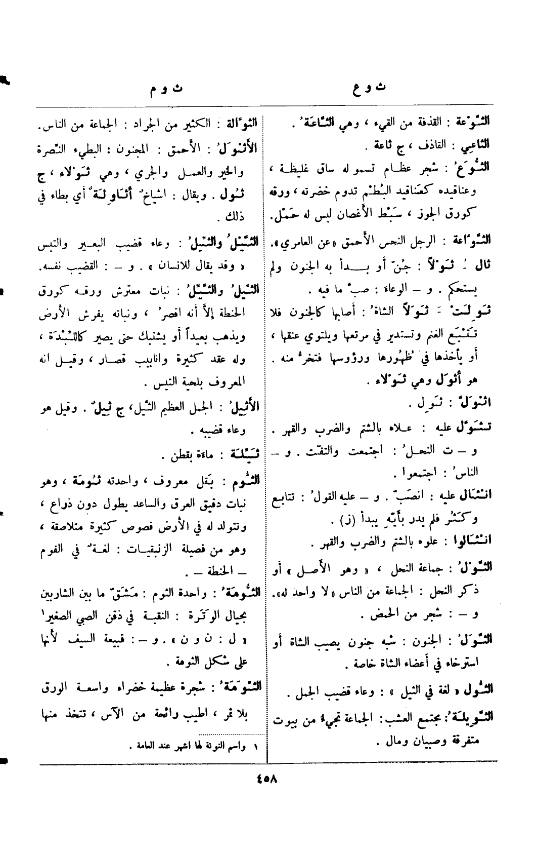 الثوم: بقل معروف، واحدته ثومة، وهو نبات دقيق العرق والساعد يطول دون ذراع، وتتولد له يف الأرض فصوص كثيرة متلاصقة، وهو من فصيلة الزنبقيات: لغة في الفوم – الحنطة -.