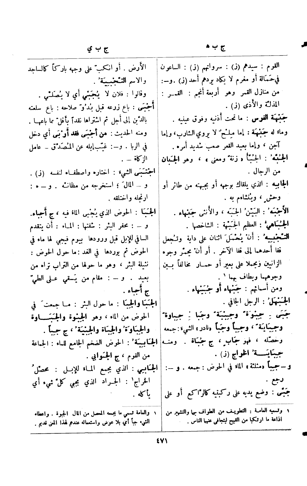 الجبا: الحوض الذي يجبى الماء فيه، ج أجباء. و-: محفر البئر: شفتها: الماء: أن يتقدم الساقي للإبل قبل ورودها بيوم فيجي لها ماء في الحوض ثم يوردها في الغد: ما حول الحوض: نثيلة البئر، وهو ما حولها من التراب تراه من بعيد. و-: مقام من يسقي على الطي ج أجباء.