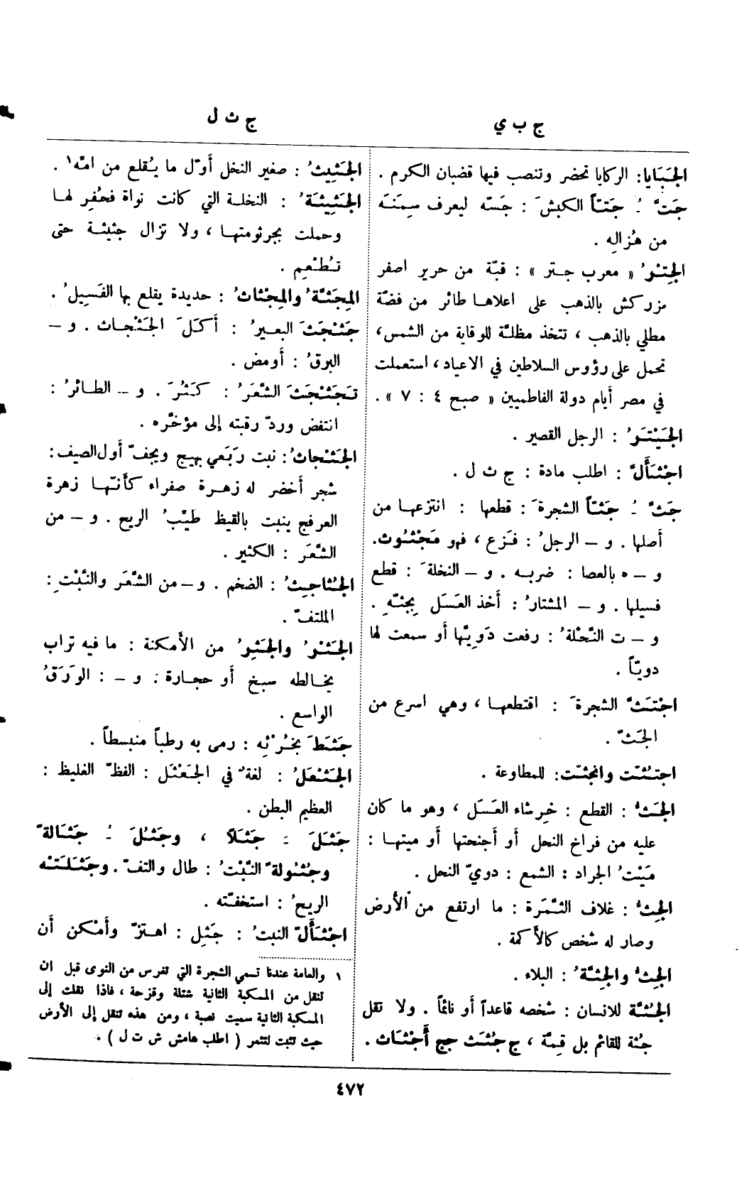 جث- جثا الشجرة: قطعها: انتزعها من أصلها. و- الرجل: فزع، فهو مجثوث. و- هـ بالعصا: ضربه. و- النخلة: قطع فسيلها. و- المشتار: أخذ العسل بجثه. و- ت النحلة: رفعت دويها أو سمعت لها دويا.