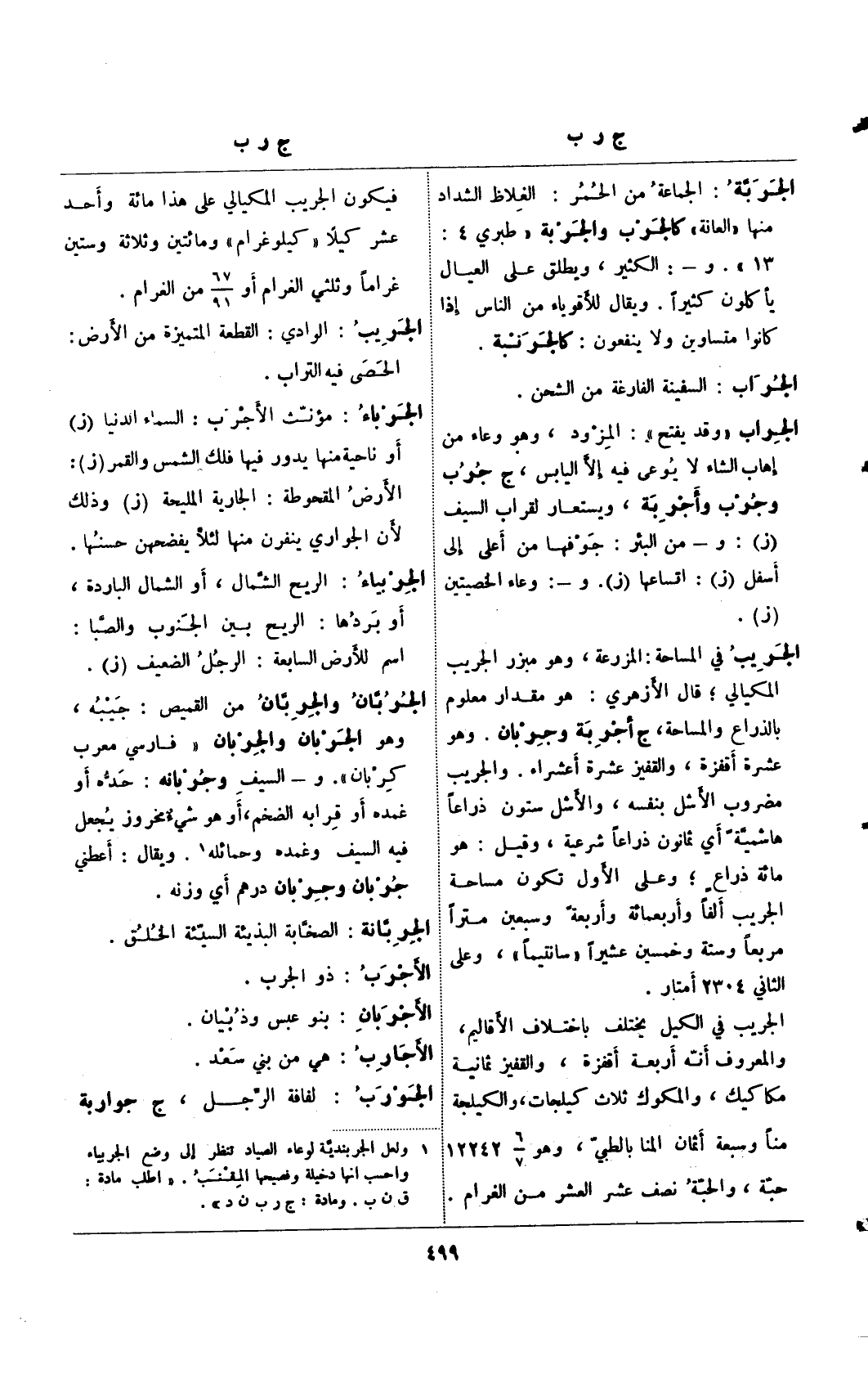 الجراب «وقد يفتح»: المزود، وهو وعاء من إهاب الشاه لا يوعى فيه إلا اليابس، ج جرب وجرب وأجربة، ويستعار لقراب السيف (ز): و- من البئر: جوفها من أعلى إلى أسفل (ز): اتساعها (ز): و-: وعاء الخصيتين (ز).